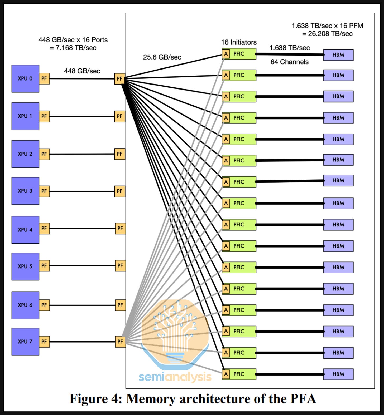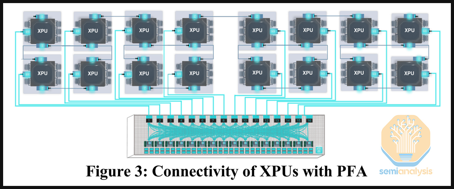 Zooming out, each PFA module is a 16-radix switch that can support up to 16 XPUs. Rather than have each XPU fan-out to all 16 ports, all-to-all connectivity occurs inside the switch box, where the Fiber Attach Unit (FAU) connected to each Switch ASIC fans out to each of the 16 switch I/Os. As such, every XPU only has one Fiber link to one switch port outside of the box.