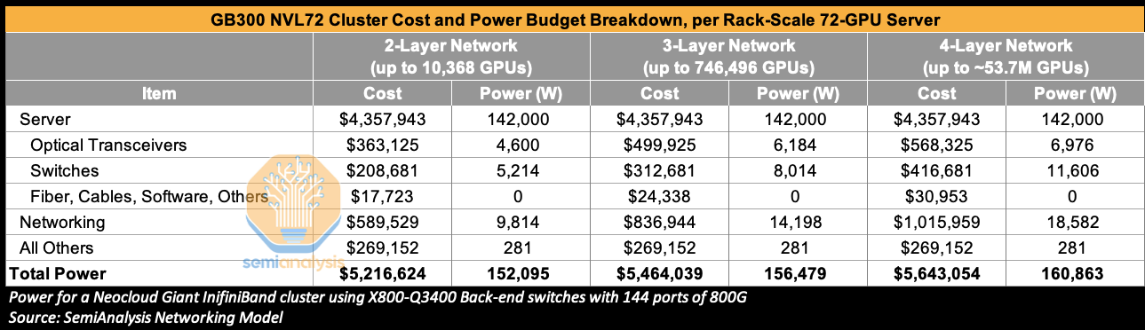 Zooming out – networking cost is the second largest component of total AI cluster cost behind the AI server itself. In a GB300 NVL72 Cluster with a 3-Layer InfiniBand network, this stands at 15% of total cluster cost, reaching 18% of total cluster cost for a 4-Layer network. Optical transceivers are a significant portion of this cost, accounting for 60% of networking cost for a 3-Layer network when using the relatively more expensive Nvidia LinkX Transceivers. They also consume 45% of total networking power for a 3-Layer network.