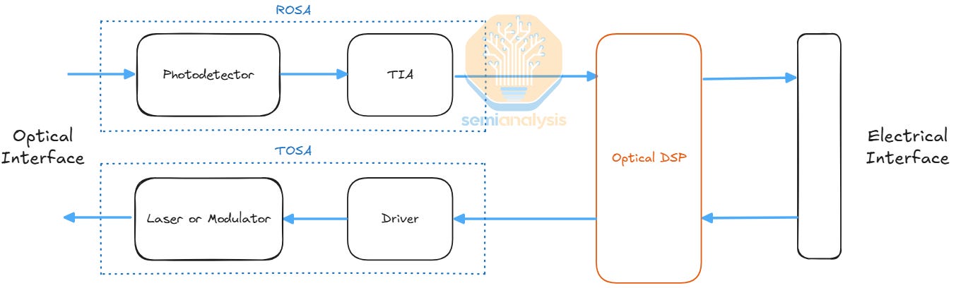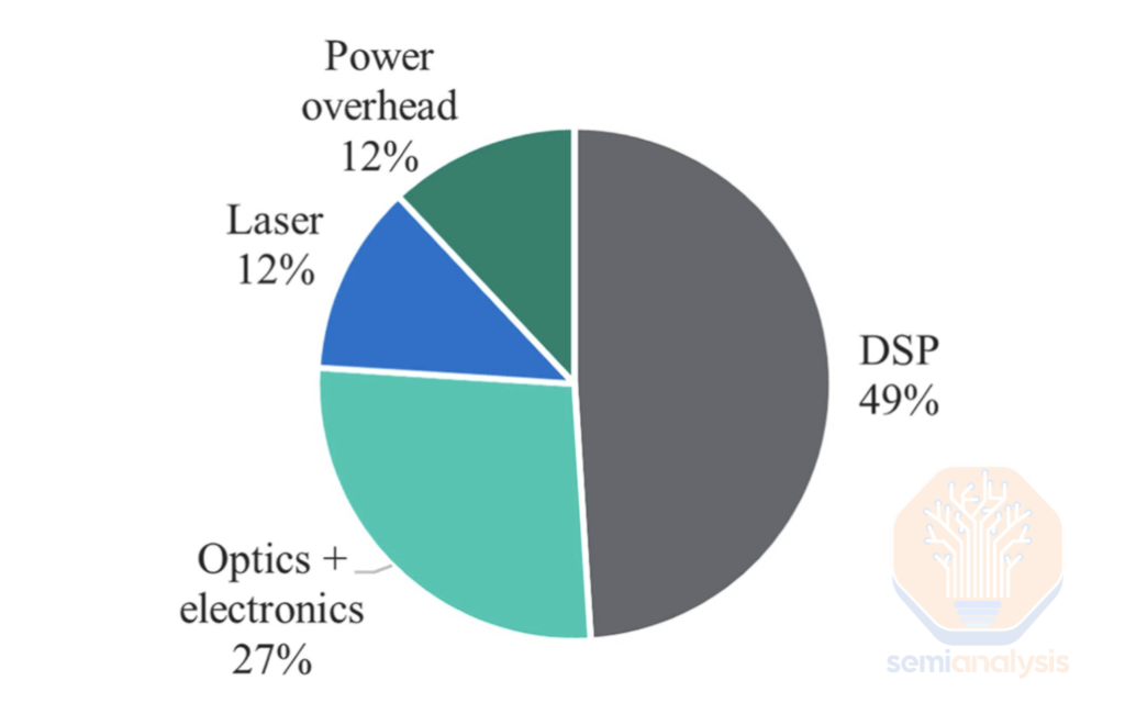The DSP chip is one of if not the most power-hungry and expensive components within the transceiver. For an 800G SR8 Transceiver – the DSP accounts for nearly ~50% of the module’s total power consumption, which is why there has been so much focus on getting rid of the DSP.