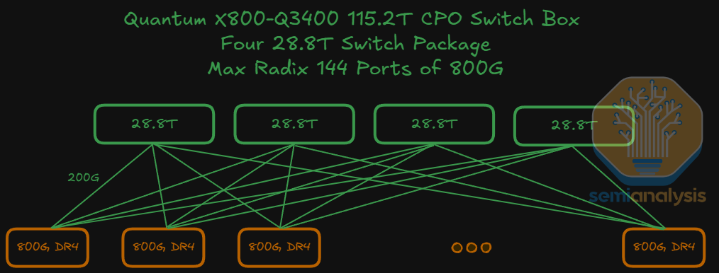 The use of Nvidia’s CPO scale-out switches implicitly means a high radix network is used by default, though this is “abstracted” from the end users because the shuffle happens inside the switch box as opposed to outside the switch box via patch panels or octopus cables when using high radix non-CPO switches. Instead, these Nvidia CPO switches present themselves as having a very high port count – the Quantum 3450 offering 144 ports of 800G, and the Spectrum 6800 offering 512 ports of 800G for example. We use the word “by default” because Nvidia’s non-CPO InfiniBand Quantum Q3400 switch also offers 144 ports of 800G, though its other InfiniBand switches such as the QM9700 only offer 32 ports of 800G - with only the former offering this “high radix in a box” to deliver a high number of effective ports. This high port count could potentially allow customers to flatten a network from a three-Layer to a two-layer network and is also saves customers the trouble of deploying shuffle boxes and patch panels or unwieldy octopus cables and could be a key selling point. In the two-layer case, transceiver power is reduced by 84%, switch power is down by 21% and total networking power can be reduced by 48% vs traditional DSP transceivers.