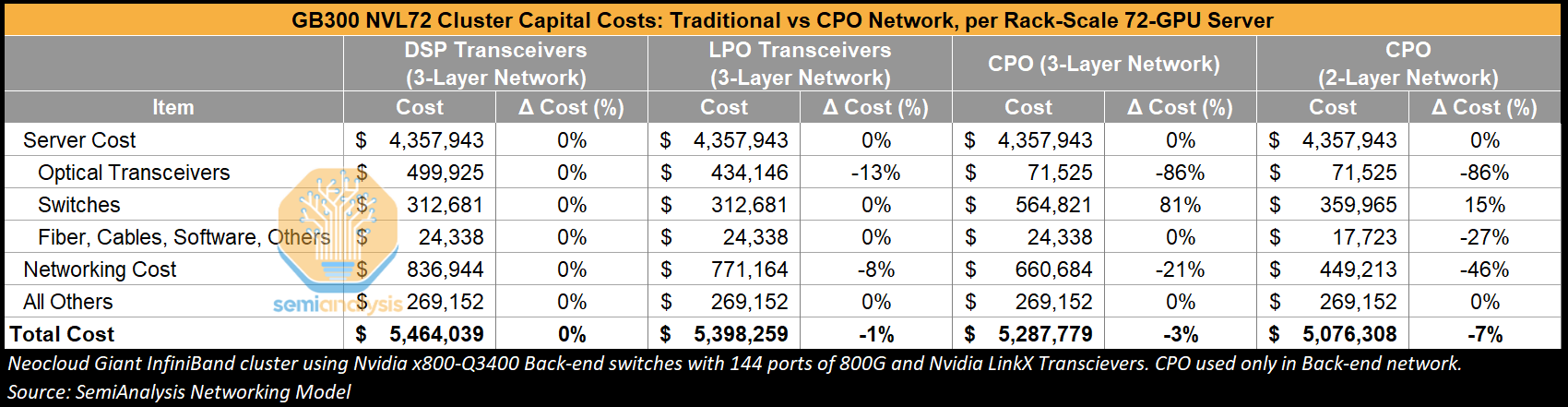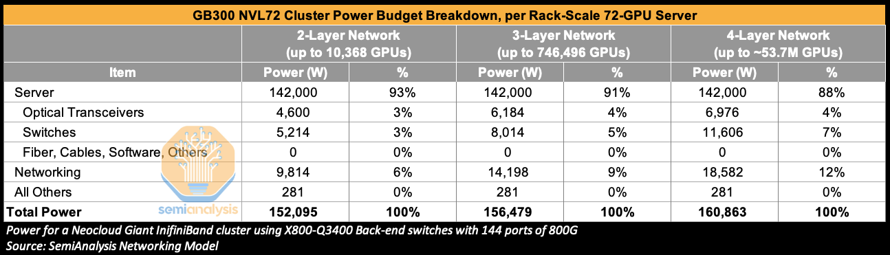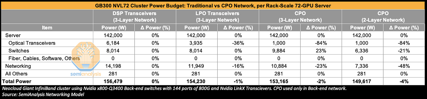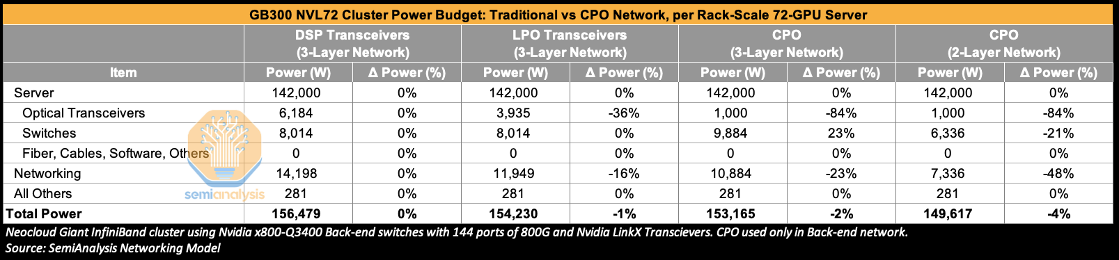 Earlier this year, at GTC 2025, Nvidia’s CEO Jensen Huang highlighted the immense power consumption from transceivers alone as a key impetus for CPO. Using some of the per-rack power budgets from the above table, a 200,000 GB300 NVL72 (72 GPU packages and 144 compute chiplets per rack) GPU cluster on a three-layer network would consume 435 MW of Critical IT Power of which 17 MW would be consumed by optical transceivers alone. Clearly there is an immense amount of power that can be saved by eliminating most of the transceiver content.