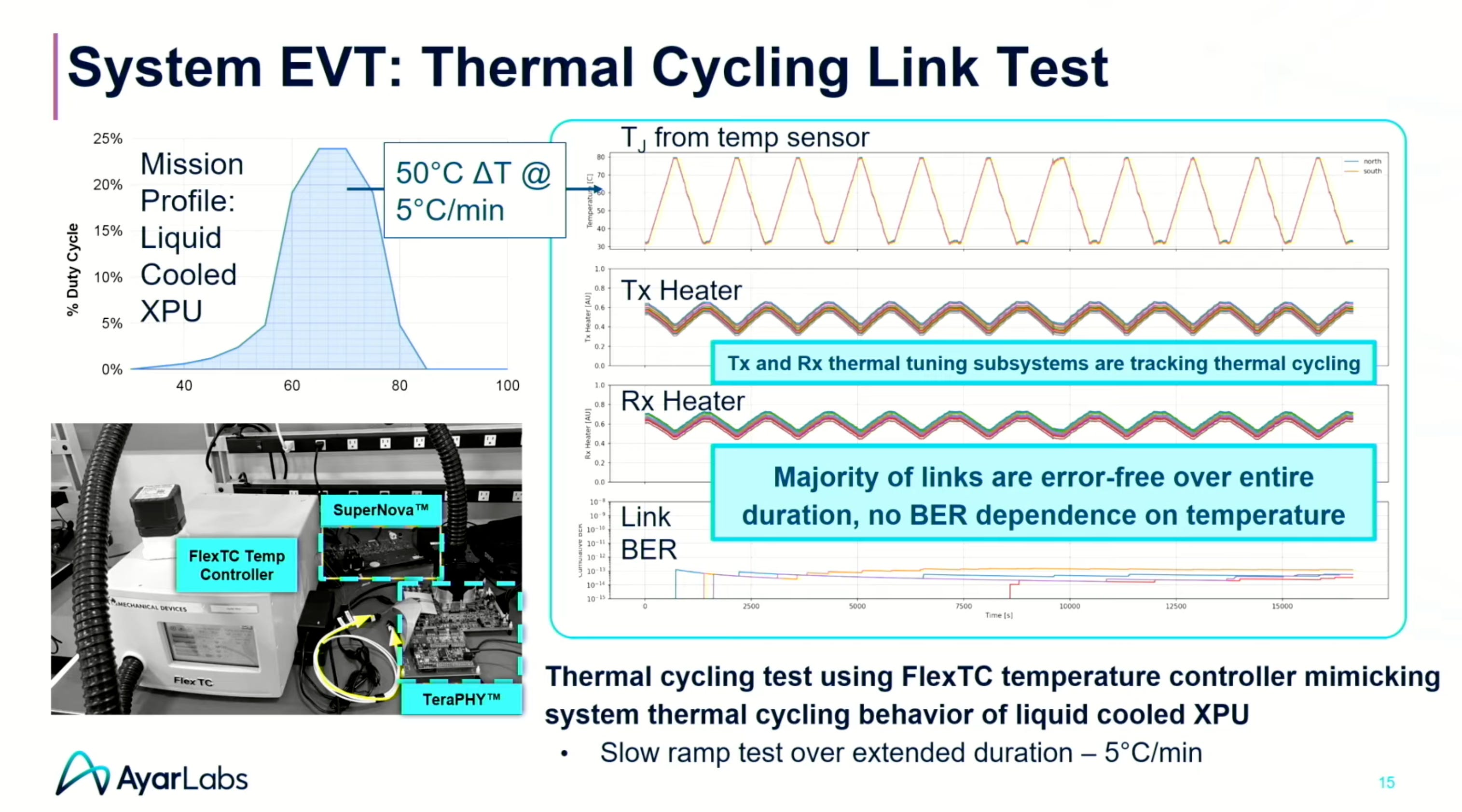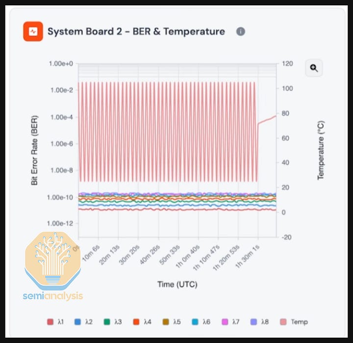 At Hot Chips 2025, Ayar Labs shared results a slow thermal cycling link test – showing over four hours of thermal cycling at a rate of about 5C/min, demonstrating strong link BER throughout.