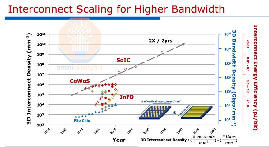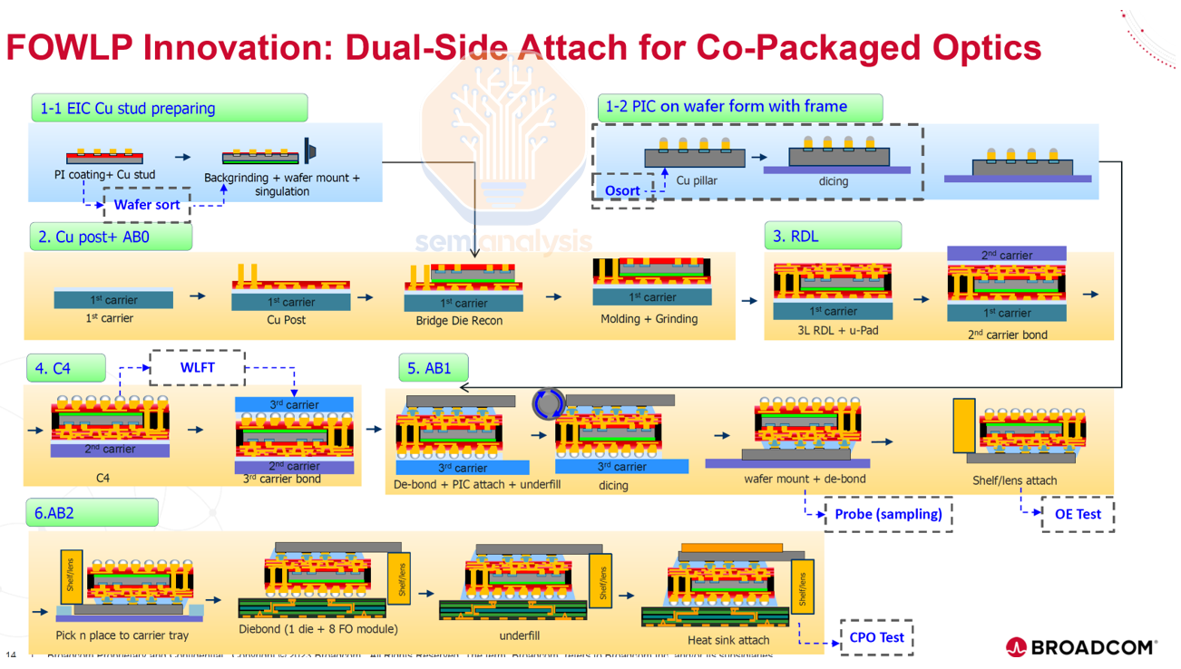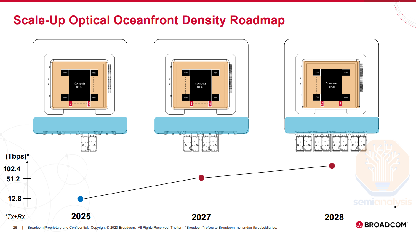 Broadcom revealed at Hot Chips 2024 an experimental design that integrates a 6.4 Tbit/s optical engine onto a package with one logic die, two HBM stacks, and a SerDes tile. They proposed using a fan‐out approach that places HBM on the east and west edges of the substrate, allowing room for two optical engines on the same package. By moving from CoWoS‐S to CoWoS‐L, you move to substrates that exceed 100 mm on an edge. As such, they will be able to accommodate up to four optical engines and achieve 51.2 Tbit/s of bandwidth.