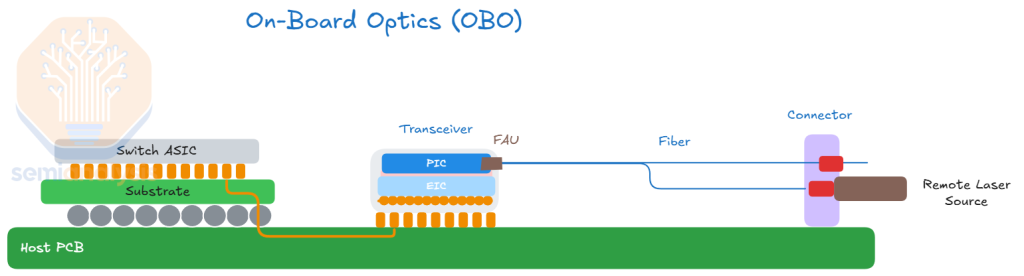 There is also On-Board Optics (OBO), which integrates the optical engine onto the system PCB inside the chassis, positioning it closer to the host ASIC. However, OBO inherits many of the challenges of CPO, while delivering fewer benefits in terms of bandwidth density and power savings. We view OBO as the “worst of both worlds” because it combines the complexity of CPO while inheriting some of the limitations of front-pluggable optics.