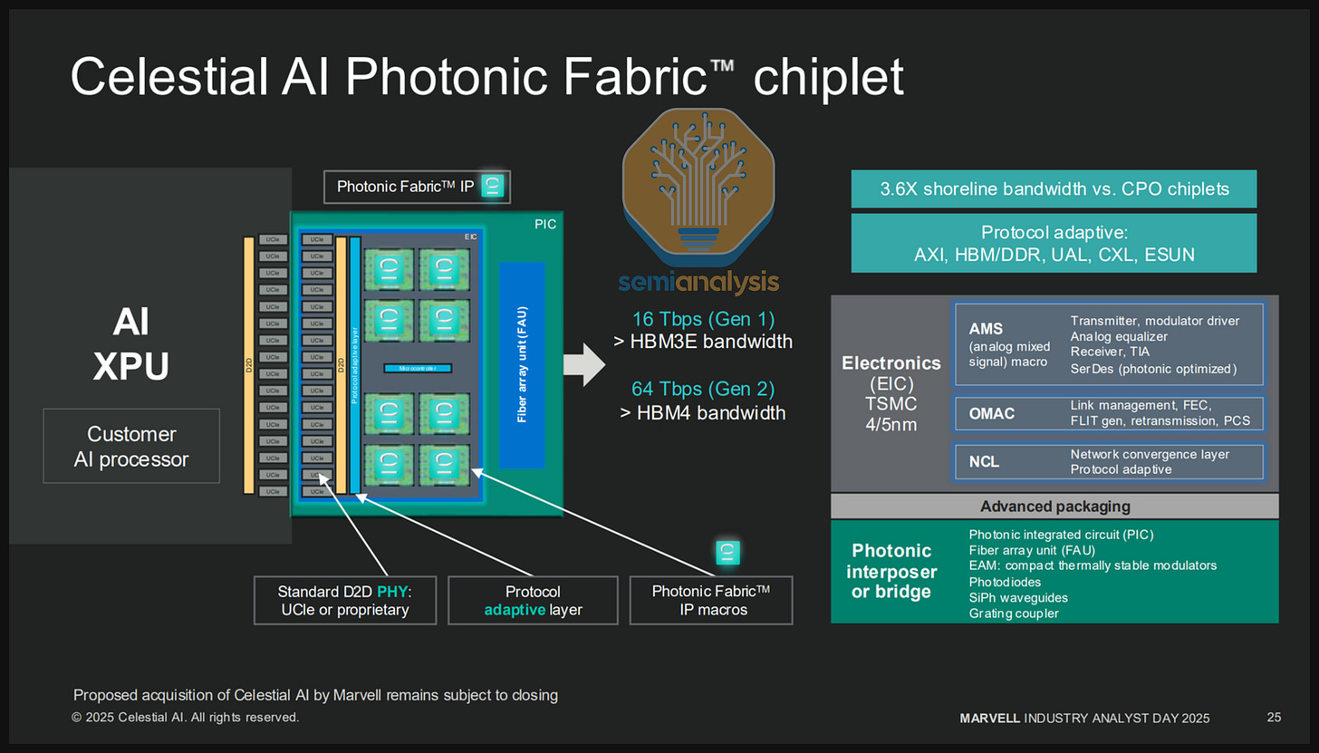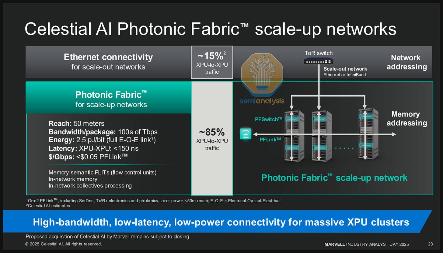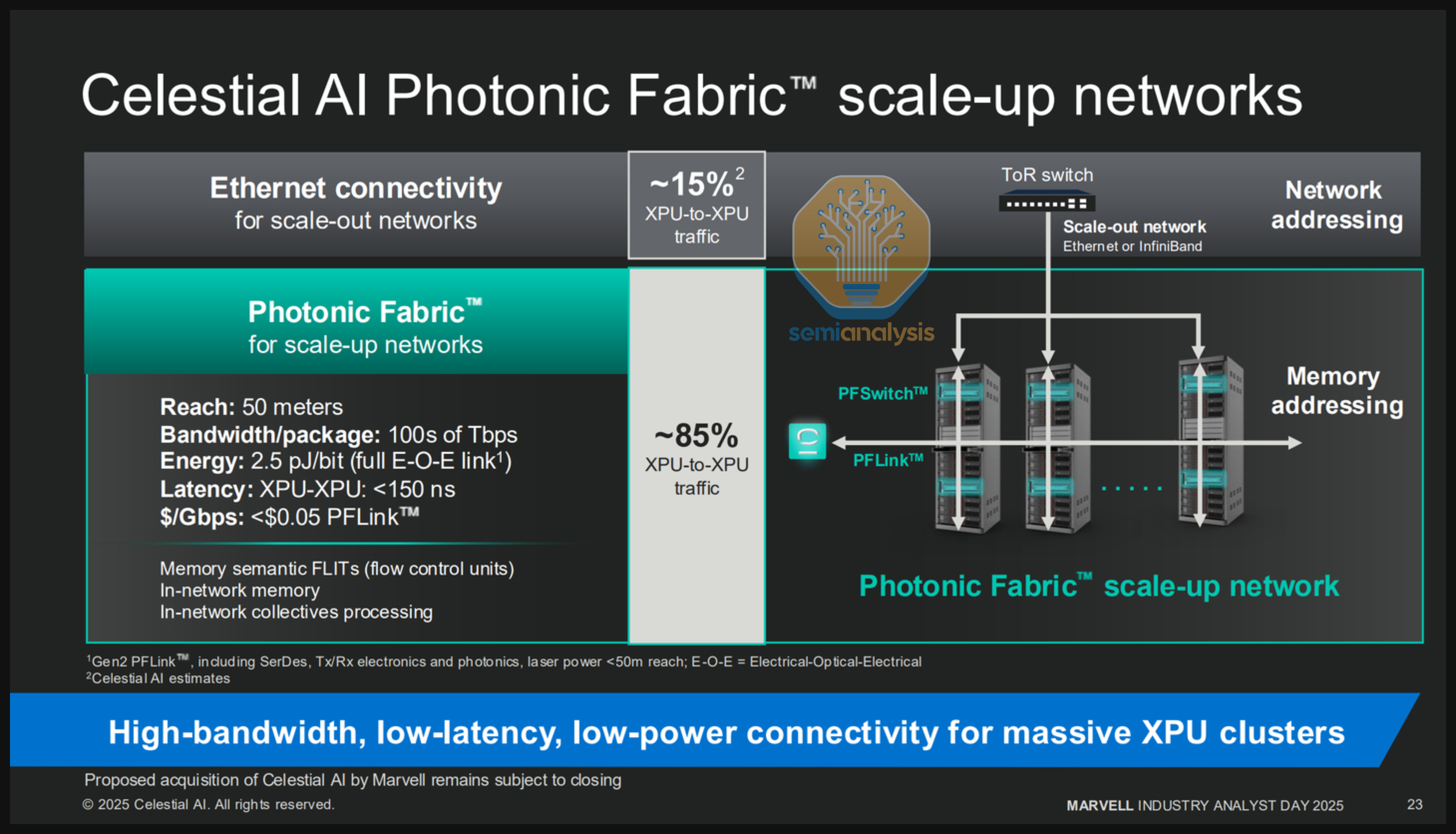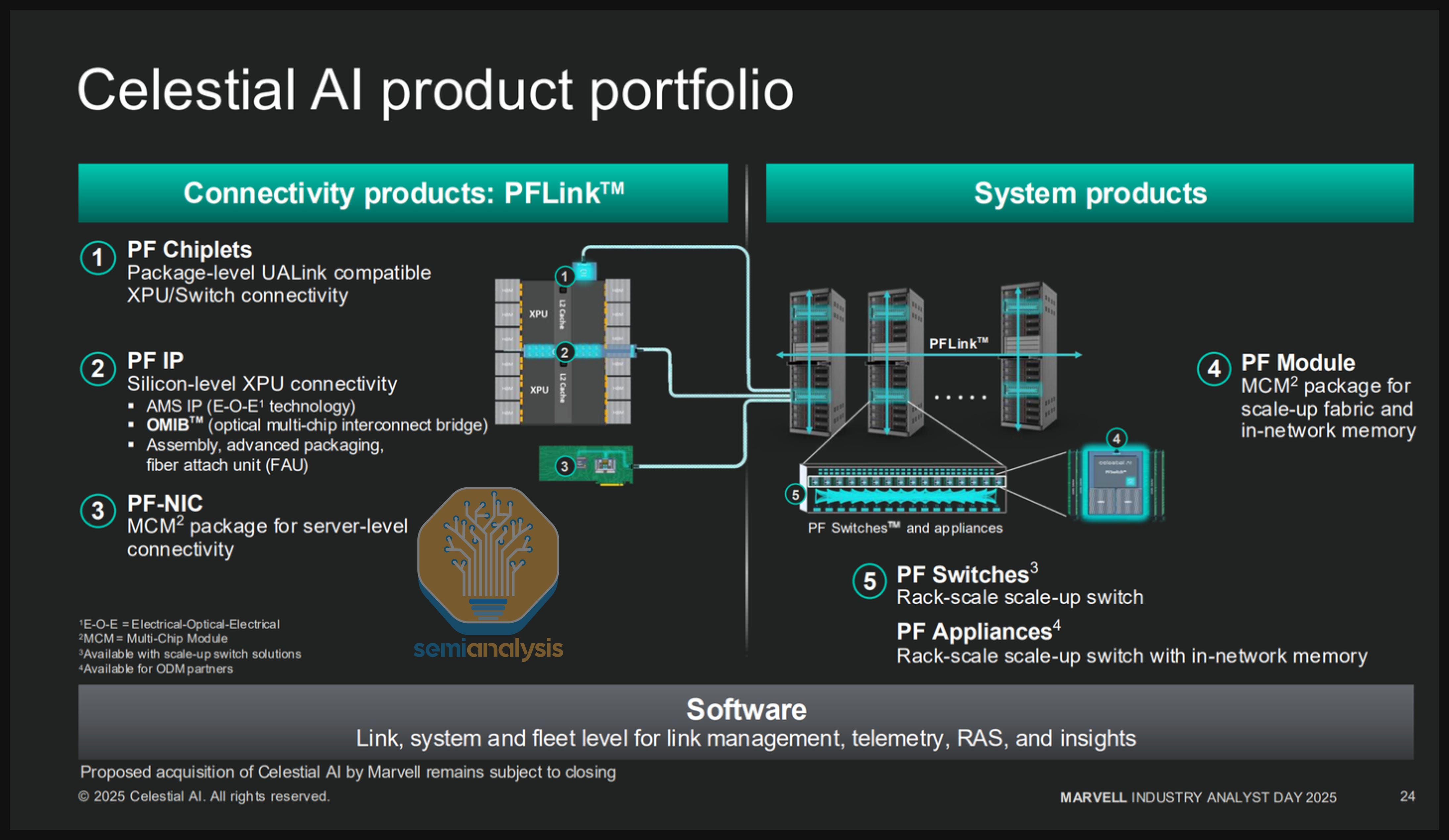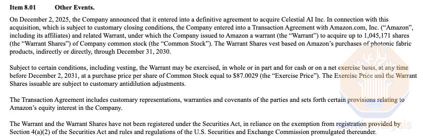 In connection with the Celestial AI acquisition, Marvell filed an 8-K report on December 2, 2025 issuing Amazon warrants with an exercise price of $87.0029 through December 31, 2030. These warrants vest “based on Amazon’s purchases of Photonic Fabric products, indirectly or directly, through December 31, 2030”, strongly suggesting that AWS’s Trainium will be the target product as this starts to ramp in late 2027. At Marvell’s Industry Analyst Day, Celestial AI discussed how a major hyperscaler selected them for optical interconnectivity for advanced AI systems that will move into volume production in that hyperscaler’s next generation processor. This, together with the earn-out timing and product revenue guidance in the transaction summary suggests that Celestial AI is targeting to deploy its solution within Trainium 4.