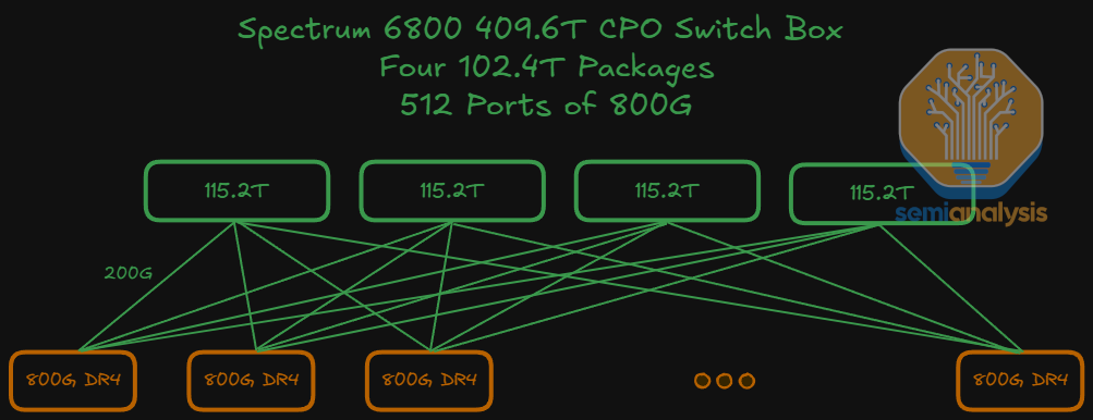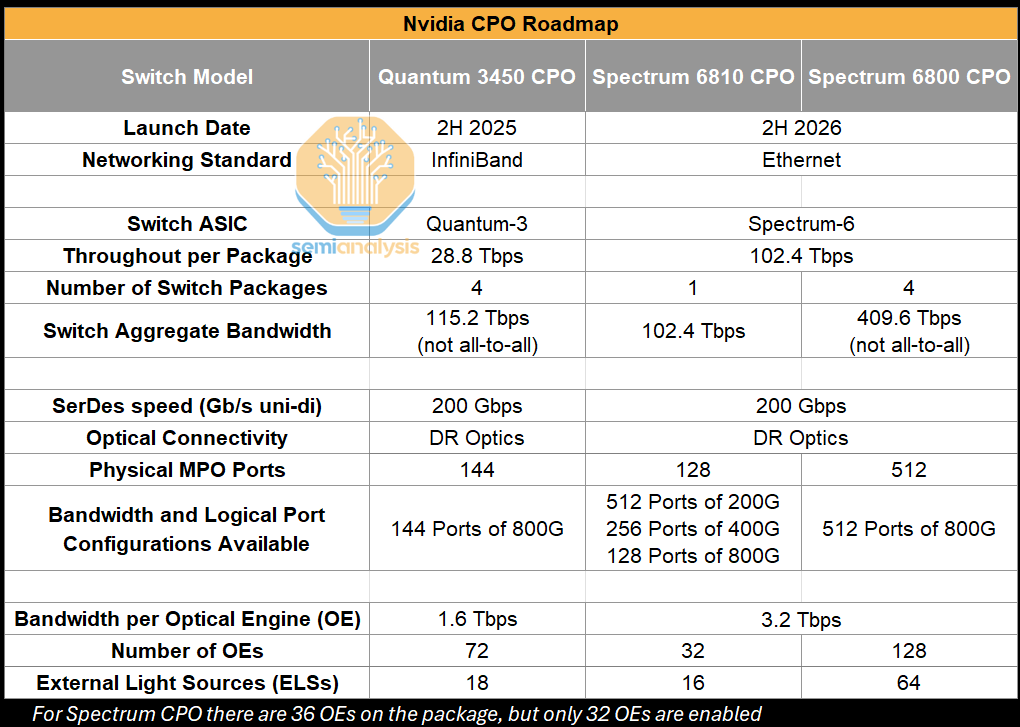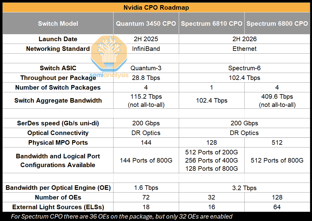Spectrum-X Photonics is set for release in the 2nd half of 2026, with two separate switch configurations products to be released, an Ethernet Spectrum-X variant of the X800-Q3450 CPO switch with 102.4T aggregate bandwidth, the Spectrum 6810 offering 102.4T aggregate bandwidth, and its larger cousin the Spectrum 6800 offering 409.6T aggregate bandwidth by using four discrete Spectrum-6 multi-chip modules (MCMs).