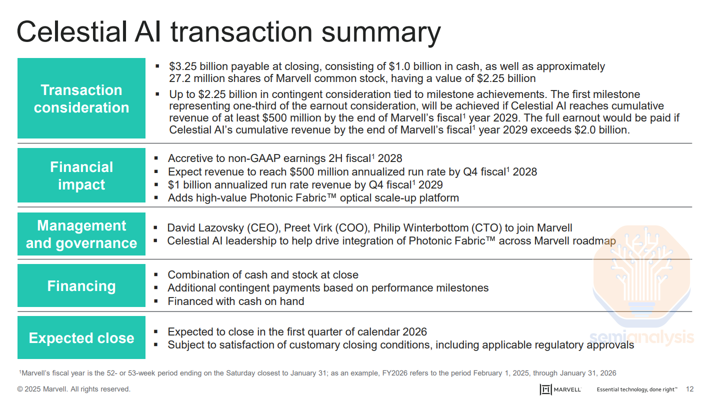 As part of the deal terms, an additional $2.25B of payout to Celestial AI’s equity holders is contingent upon the company achieving a cumulative revenue of at least $2.0 billion by January 2029 (the end of Marvell’s Fiscal Year 2029 – i.e. F1/29). This first milestone towards that full payout is achieving $500M of cumulative revenue by January 2029 for one third of the payout. The $1B revenue run rate expected exiting F1/29 is half of the earn-out amount – implying that Celestial will need to add additional customers to the order book to achieve the $2B earn-out target.