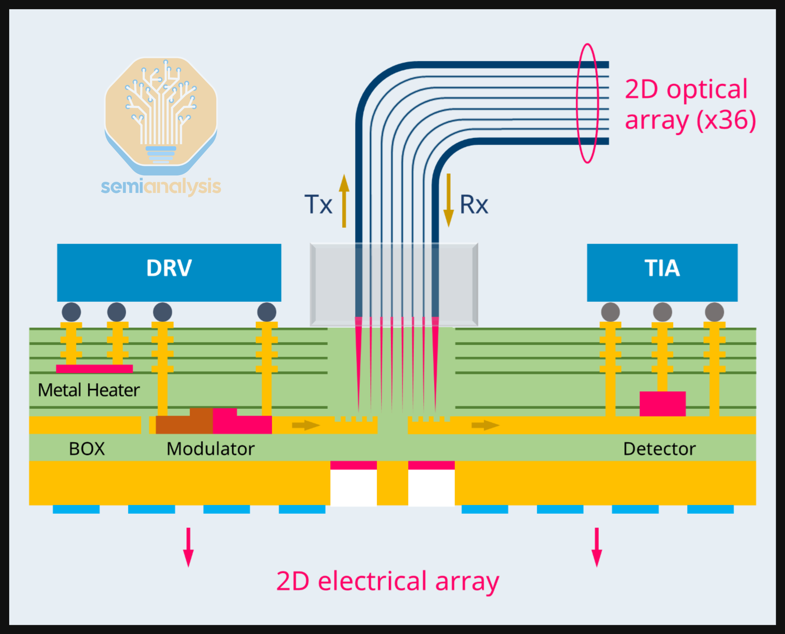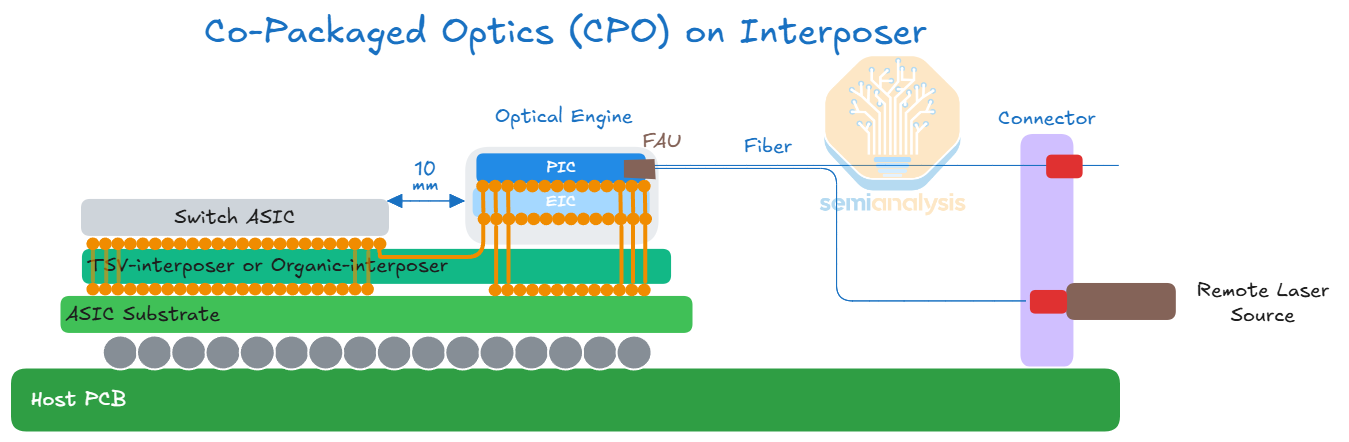 The schematic below illustrates a CPO implementation, where there is an optical engine that resides on the same package as the compute or switch chip. Optical engines will initially be on the substrate, with OEs placed on the interposer in the future.