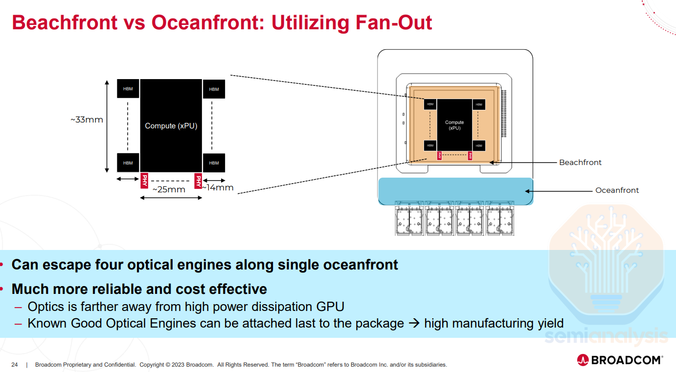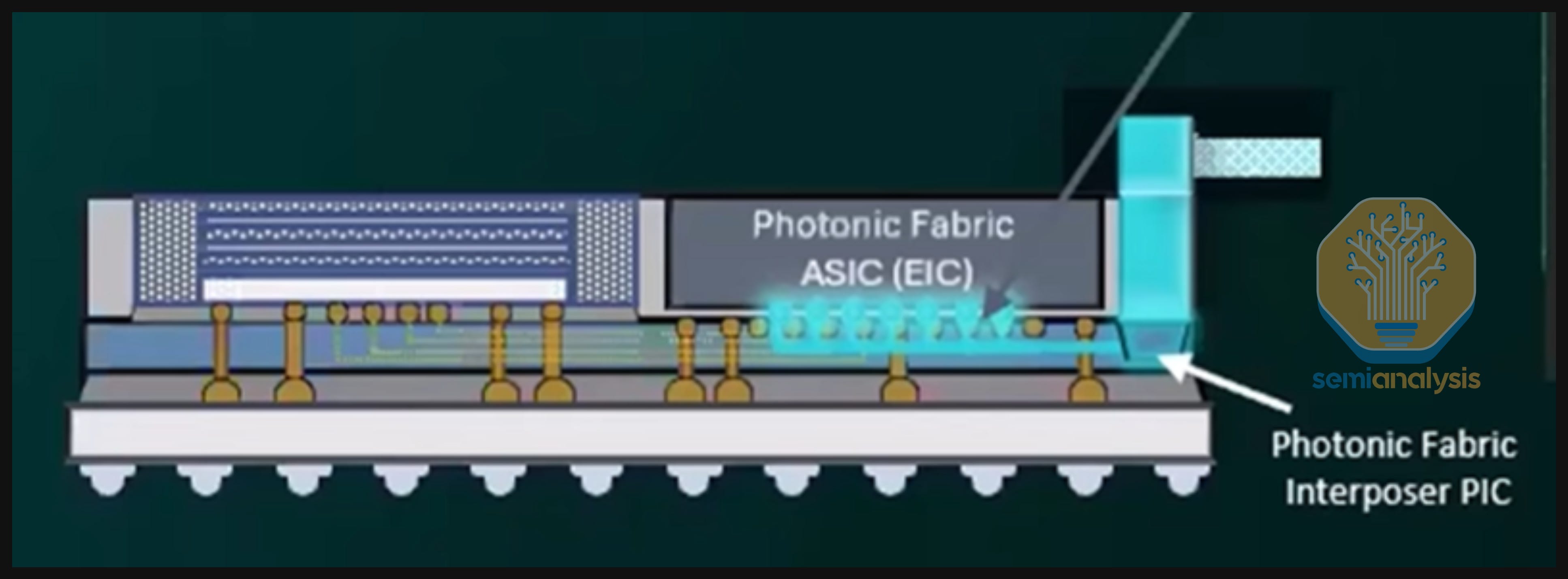 The optical I/O (Photonic Fabric IP) is mounted in the middle of the ASIC, rather than at the beachfront, which frees up the shoreline for other use cases.