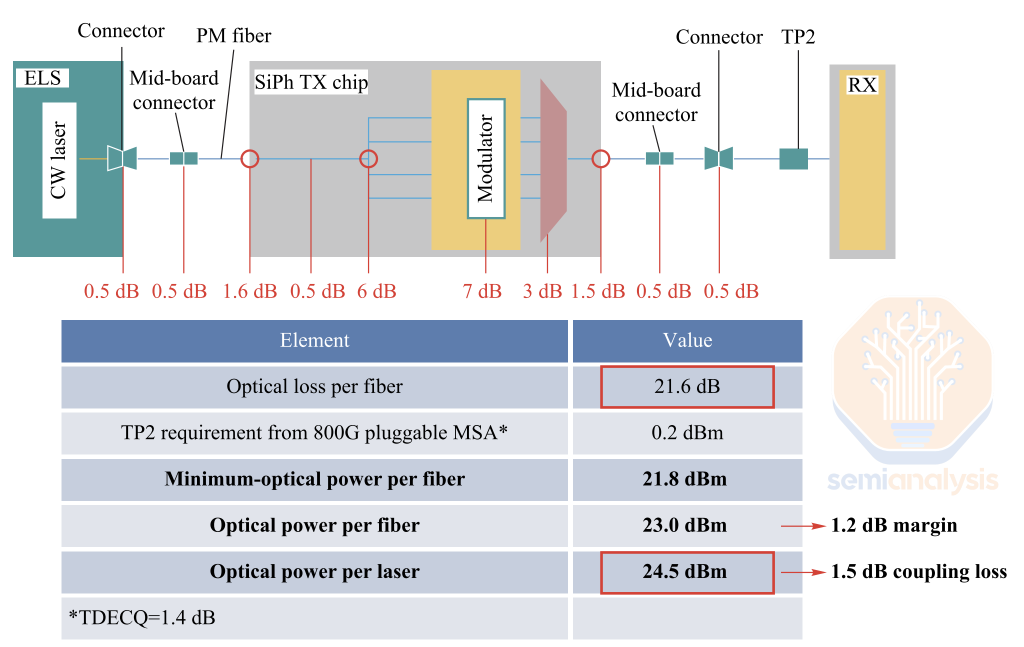 This can be easily seen by comparing the power used in just one 800G DSP transceiver to the power consumed by optical engines and laser sources (per 800G bandwidth) within a CPO system. While an 800G DR4 optical transceiver consumes about 16-17W, we estimate that the optical engine together with external laser sources used in Nvidia’s Q3450 CPO switch consume about 4-5W per 800G of bandwidth, a 73% reduction in power.
