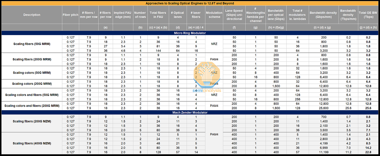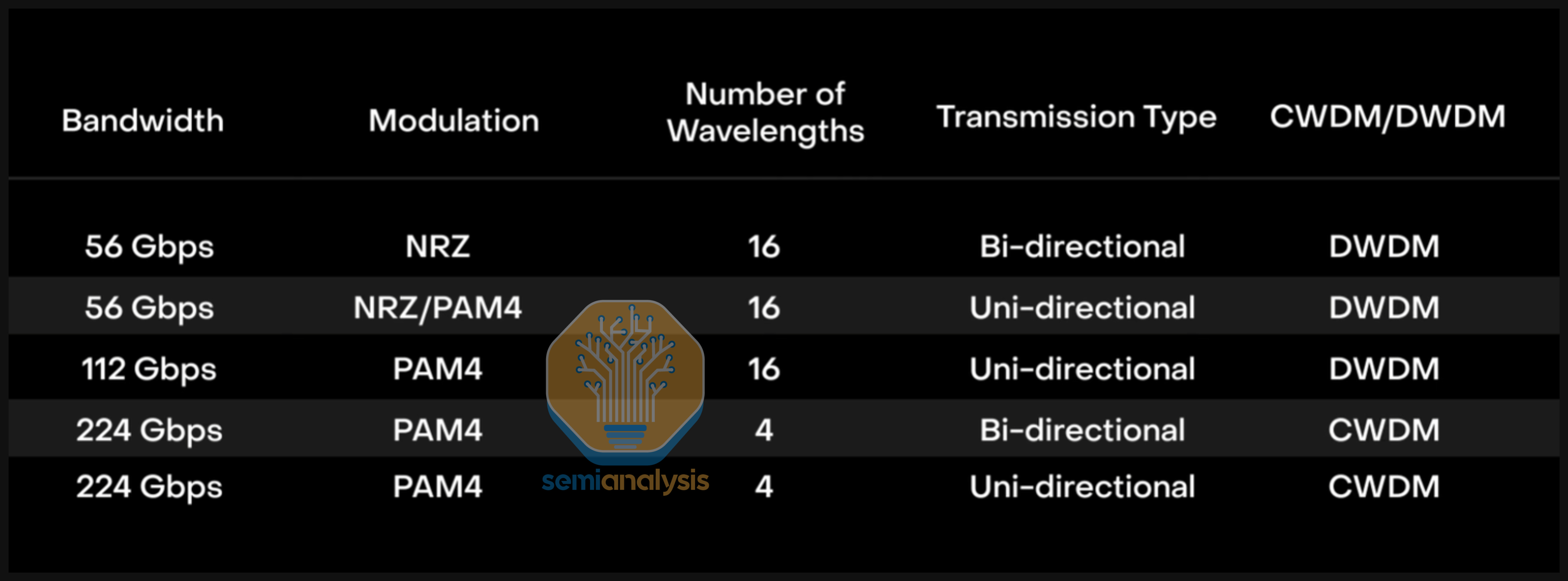 Scaling bandwidth on copper is also increasingly difficult. With Rubin, Nvidia is achieving the doubling of bandwidth by implementing a novel bi-directional SerDes technology, where both transmit and receive operations share the same channel, enabling full-duplex communication at 224Gbit/s transmit + 224Gbit/s receive per channel. Achieving “true” 448G per lane on copper remains another challenging feat with an uncertain time to market. In contrast, CPO presents multiple vectors for scaling bandwidth: Baud rate, DWDM, Additional Fiber Pairs and Modulation – all of which will be discussed in detail later in this article.