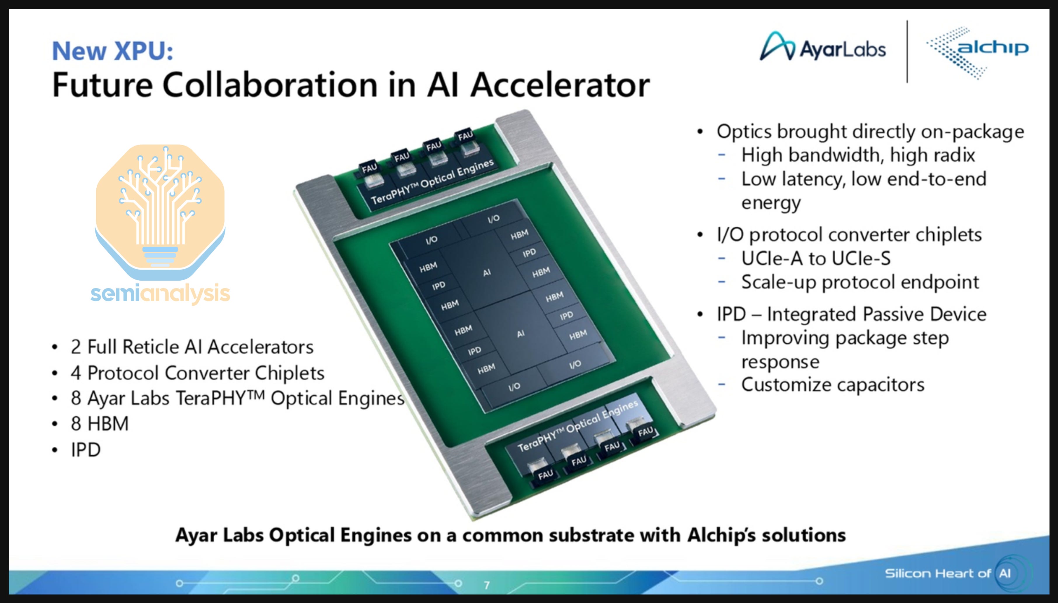Ayar’s third generation of TeraPHY pivots to using TSMC COUPE and can deliver more than 3x the bandwidth of the second generation at 13.5 Tbit/s uni-directional per each optical engine, with 8 optical engines providing the ~108Tbit/s of total package scale-up bandwidth for the XPU solution featured in the Ayar Labs – Alchip collaboration below. This ~13.5+Tbit/s is achieved using ~200Gbit/s of bandwidth per lambda using PAM4 Modulation.