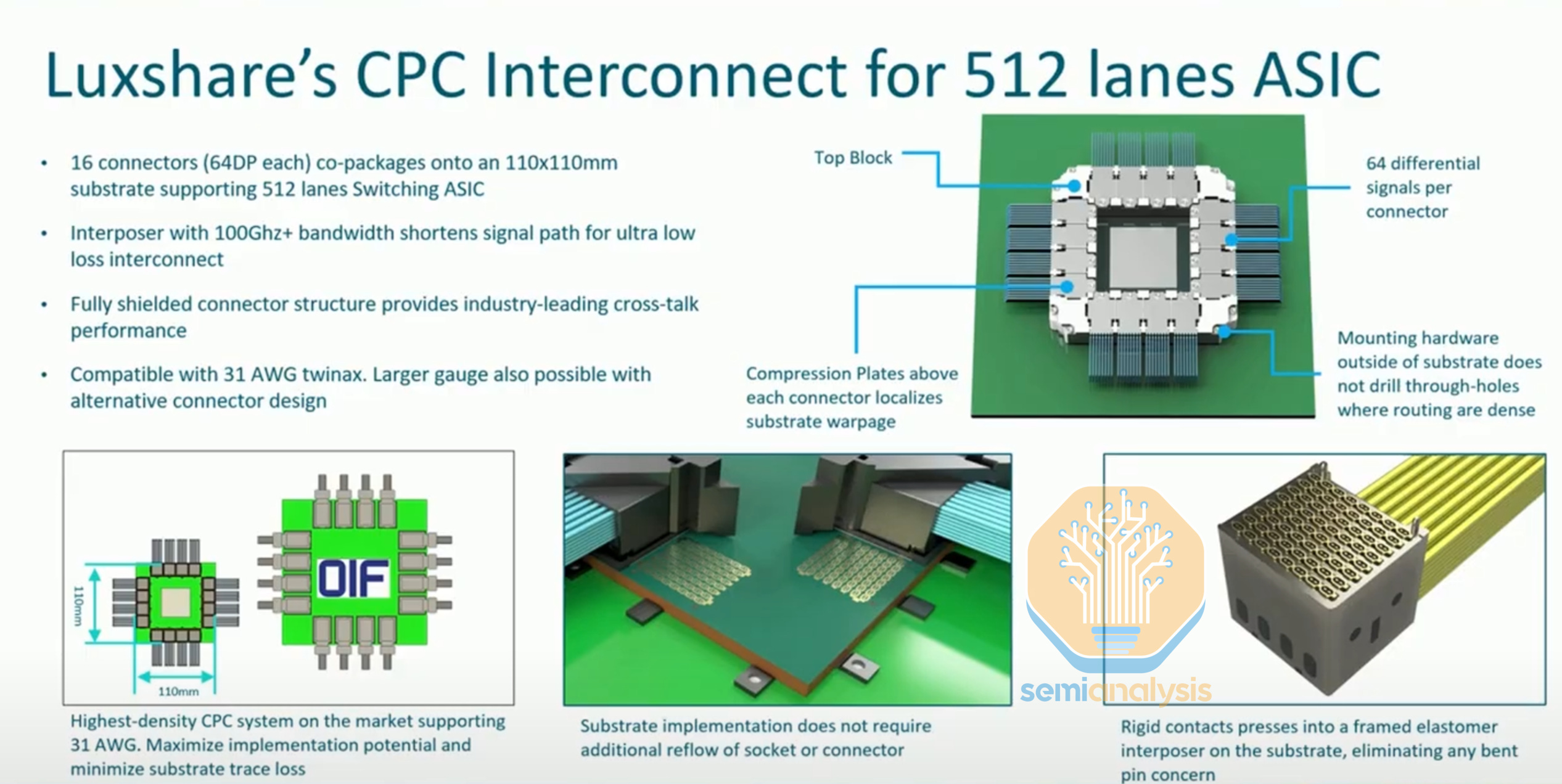 Another alternative to CPO is “Co-packaged Copper” (CPC). CPC uses copper cabling emerging directly from a connector on substrate. Cables use for CPC are the same cables as flyovers and have the same purpose: to bypass the PCB traces. CPC takes flyover cables further with the socket starting on the package substrate itself. The cables used are twin-axial cables (Twinax cables) that are well insulated to reduce cross-talk, resulting in significantly lower insertion loss compared to conventional electrical traces. Though this solution still uses copper, it offers a key advantage in signal integrity. CPC could provide a practical path to deploying 448G SerDes so as to allow another scaling of off-package interconnect.