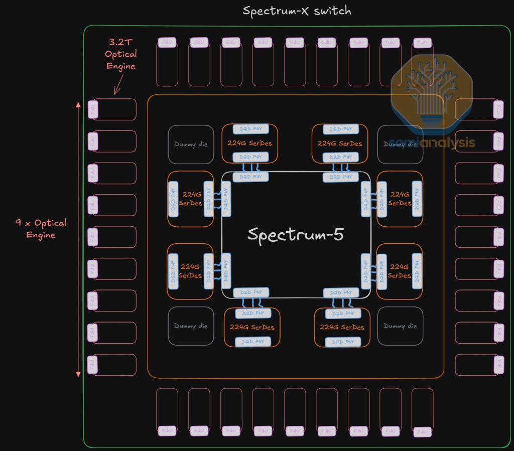 The Quantum X800-Q3450 CPO switch utilizes four discrete switch packages connected to the physical in a multi-plane configuration, and each switch package is a monolithic die containing the 28.8T switch ASIC together with required SerDes and other electrical components. In contrast, Spectrum-X Photonics switch silicon is a multi-chip module (MCM) with a much larger reticle size 102.4T switch ASICs at the center, surrounded by eight 224G SerDes I/O chiplets – two on each side.