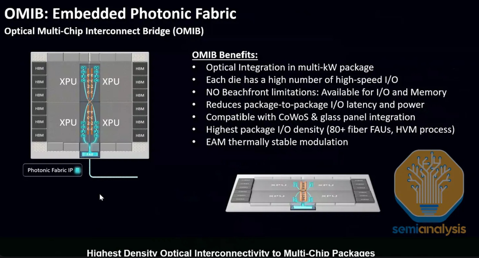 Next, the Photonic FabricTM Optical Multichip Interconnect BridgeTM (OMIBTM) is essentially a CoWoS-L style or EMIB style packaging solution. It adds photonics directly onto the embedded bridge in the interposer so that the bridge can move data directly to point of consumption. It offers higher overall chip bandwidth than PF Chiplets, as it is not limited by beachfront constraints.