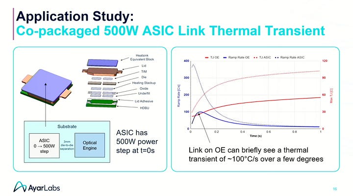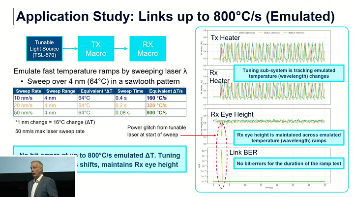 However, studying the MRM’s resilience against rapid changes in temperature is just as important as demonstrating the stability of the link over a wide temperature range over a long period of time. In the same Hot Chips talk, Ayar explained how they opted to emulate a fast temperature ramp by sweeping laser wavelength in lieu of having an on-package ASIC that can actually perform the 0 to 500W step. Control circuits detect whether the ring resonance drifts – this can be caused by either the incoming laser changing wavelength or by a change in ring temperature, so they sweep the laser wavelength at rate that corresponds to an equivalent change in temperature. For example a 20nm/s sweep would simulate a 64C change over 0.2 seconds, amounting to 320 C/s. This study showed no bit errors for up to 800C/s of temperature change.