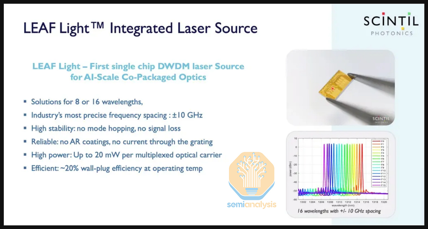 One key advantage of Scintil’s solution is power efficiency. The Scintil solution can generate and multiplex multiple colours (8 or 16) on single chip, unlike solutions using multiple discrete lasers along a combiner splitter, which require very high-power lasers to achieve the target power per multiplexed color. The Scintil solution offers superior power efficiency and increased bandwidth density, while halving the energy required for each transmitted bit. This is in comparison to existing co-packaged solutions, (including what Nvidia is currently adopting for Q3450 CPO switches), which use a single wavelength with high modulation speed rather than multiple wavelengths with low modulation speed.