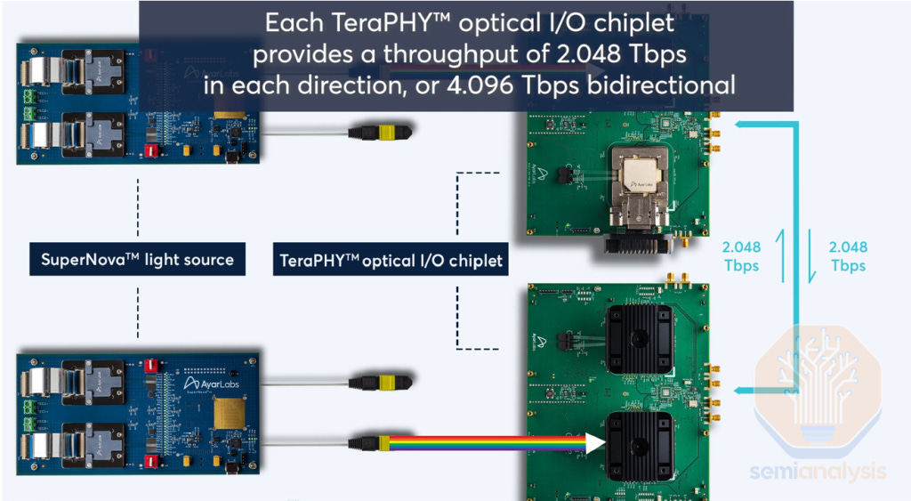 Ayar Labs has also partnered with Alchip and GUC to enable integration of their chiplet into Alchip and GUC’s XPU solutions. The above example illustrates an XPU with two reticle size compute dies and 8 TeraPHY optical engines, which could enable up to 108 Tbit/s uni-directional of bandwidth.