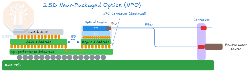 In recent years, NPO has emerged as an intermediate step toward CPO. NPO has multiple definitions. NPO is where the OE doesn’t sit directly on the ASIC’s substrate, but is co-packaged onto another substrate. The optical engine remains socketable and it can be detached from the substrate. An electrical signal will still travel from a SerDes on the XPU package through some copper channel to the Optical Engine.