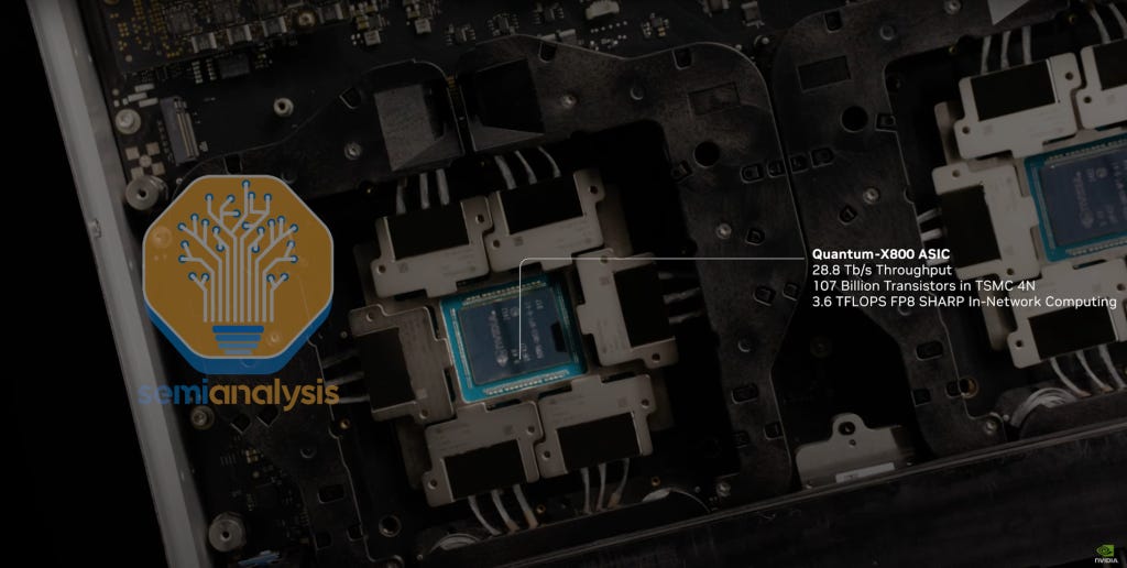 Let’s briefly zoom into some of the cost details when comparing transceivers to a CPO solution. The first Nvidia CPO Switch, the Quantum X800-Q3450 CPO will use 72 optical engines each operating at 1.6Tbit/s; later versions of Quantum CPO switches will likely transition to 36 optical engines at 3.2Tbit/s each, costing ~$1,000 per unit (including FAUs), which translate to $36k of total OE cost per system.