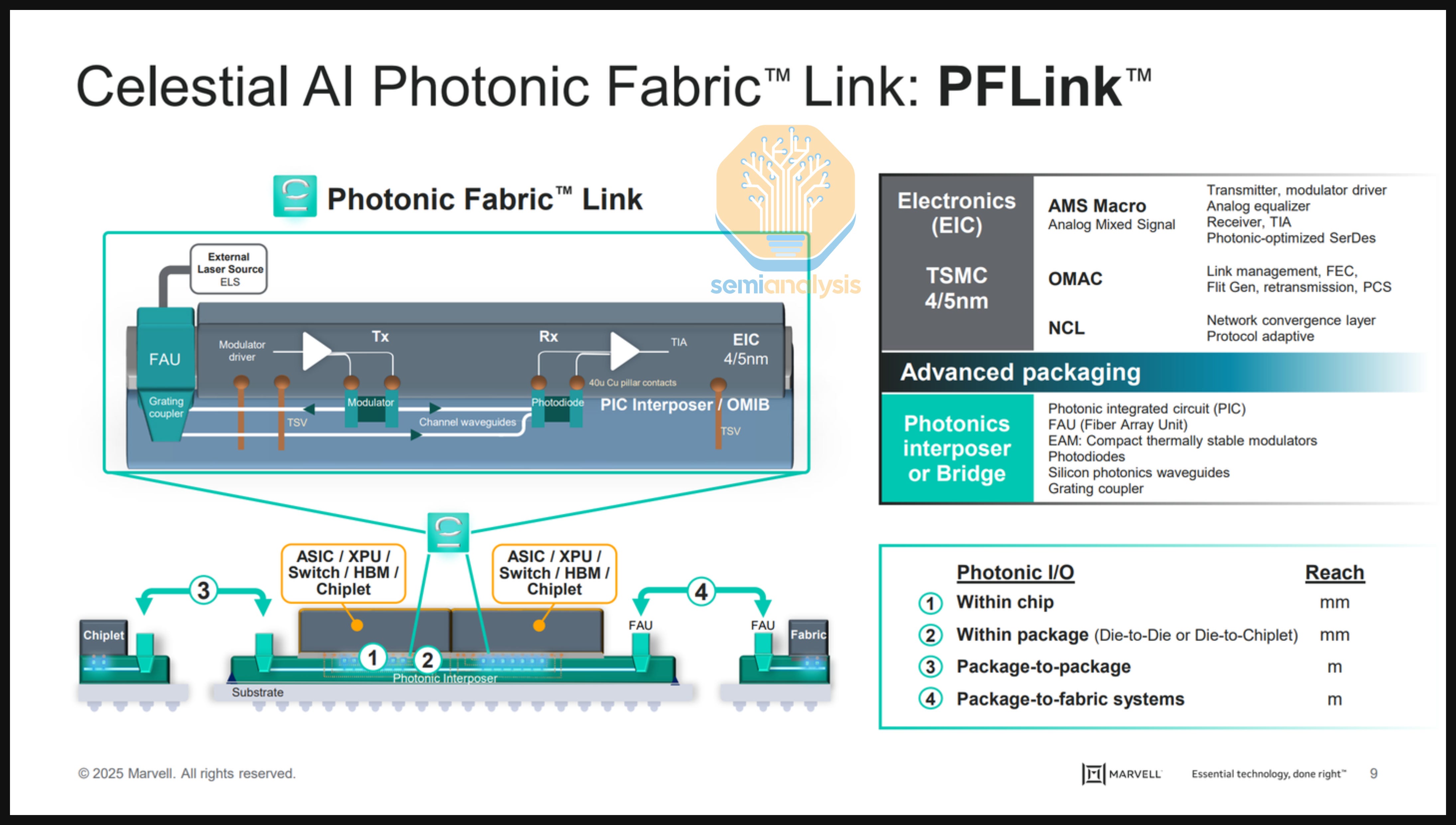 Optical chiplets offer a strong power advantage compared to traditional copper traces. Traditional copper cables with linear SerDes at 224G require ~5 pJ/bit. With two ends required, the total power consumption is ~10 pJ/bit. Celestial AI’s solution requires just ~2.5 pj/bit for the entire electrical-optical-electrical link (plus ~0.7 pJ/bit for the external laser).