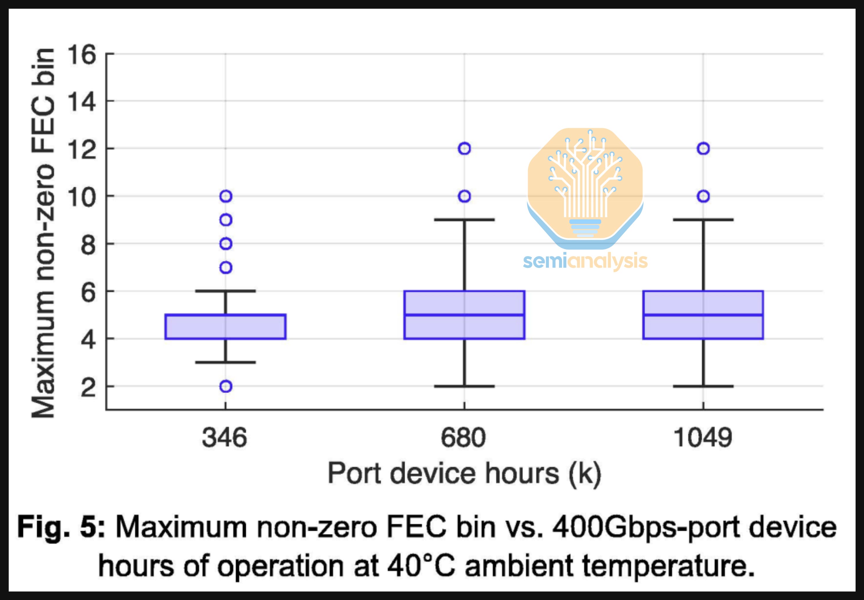 In the interim, Meta’s CPO reliability data published around ECOC provides some helpful information. Meta collaborated with Broadcom for this study, with Broadcom publishing some useful slides as well. In this study, Meta carried out a reasonably sized test run spanning up to 1,049k 400G port device hours across 15 Bailly 51.2T CPO Switches and published the maximum non-zero KP4 forward error correction (FEC) bin:
