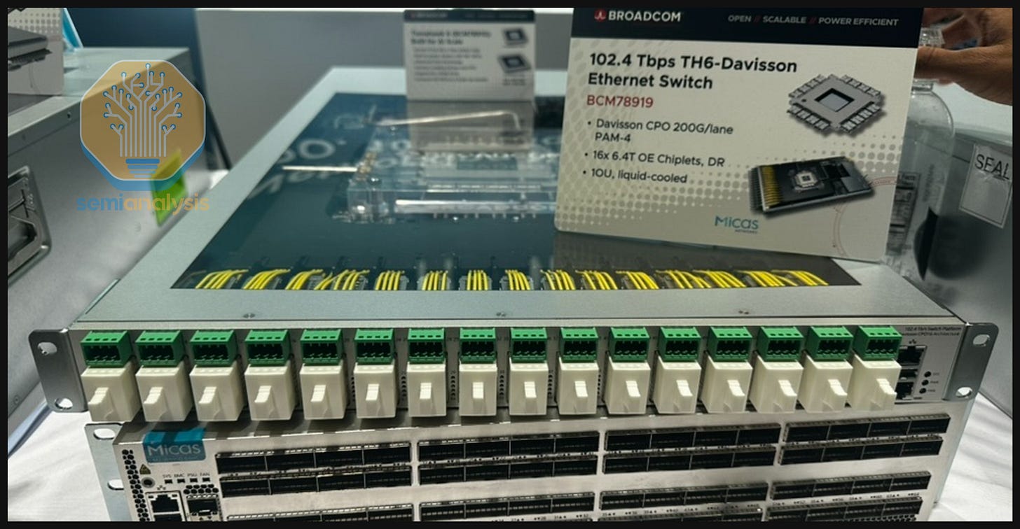 Broadcom was among the first companies to offer real CPO-enabled systems and as such is considered a leader in CPO. Broadcom’s first‐generation CPO device, known as Humboldt, served largely as proof of concept. Dubbed “TH4‐Humboldt”, it is a 25.6Tbit/s Ethernet switch that equally divides its total capacity between traditional electrical connections and CPO. Of that, 12.8Tbit/s is handled by four 3.2 Tbit/s optical engines, each delivering 32 lanes of 100 Gbit/s. This hybrid design of copper and optics has some prominent uses cases. In one scenario, top‐of‐rack (ToR) switches rely on electrical interfaces for short‐distance copper connections to nearby servers, while their optical ports uplink to the next tier of switching. In another scenario, at the aggregation layer, electrical ports interconnect the various switches within a rack, and optical links extend to switching tiers above or below that layer.