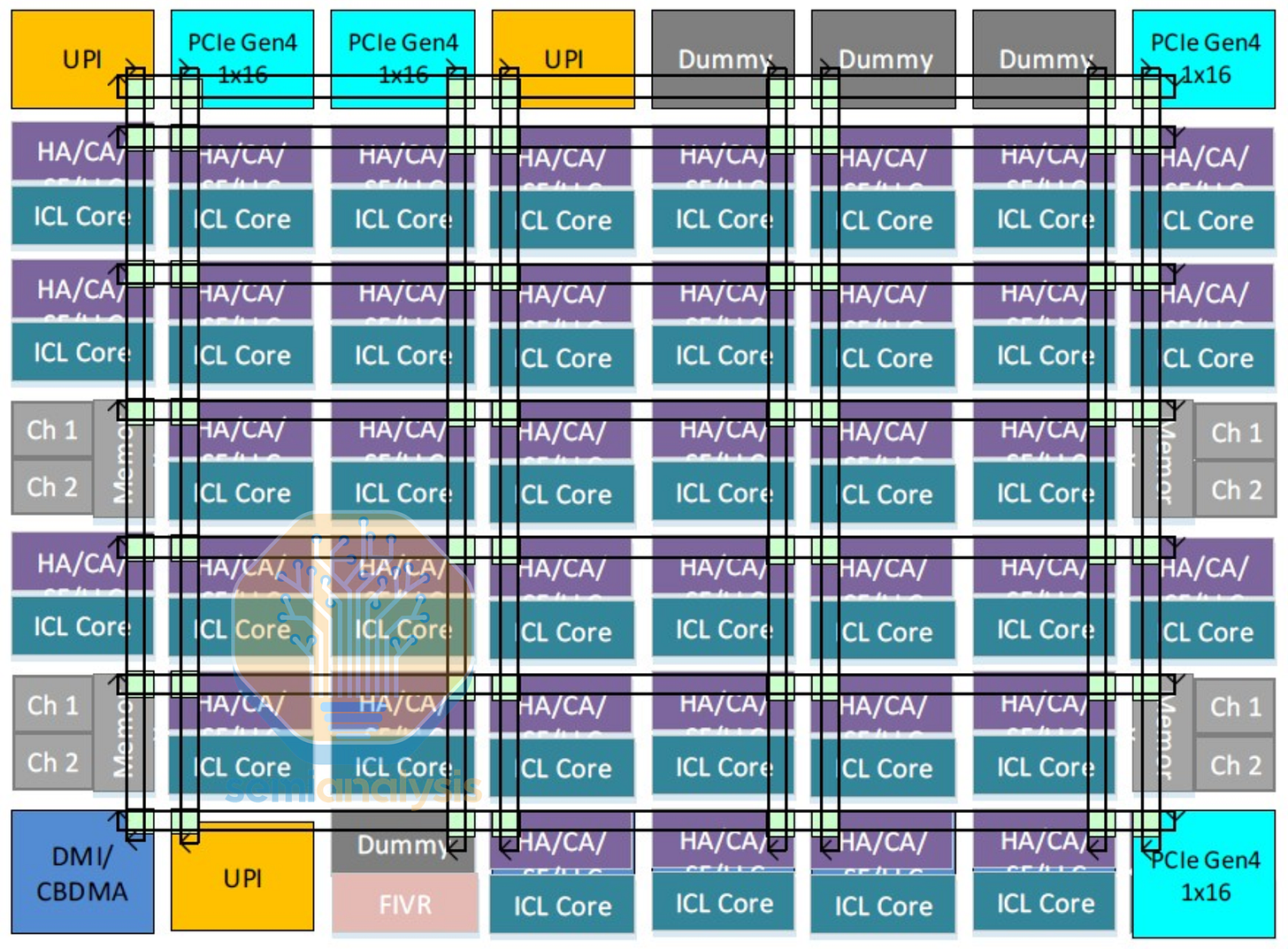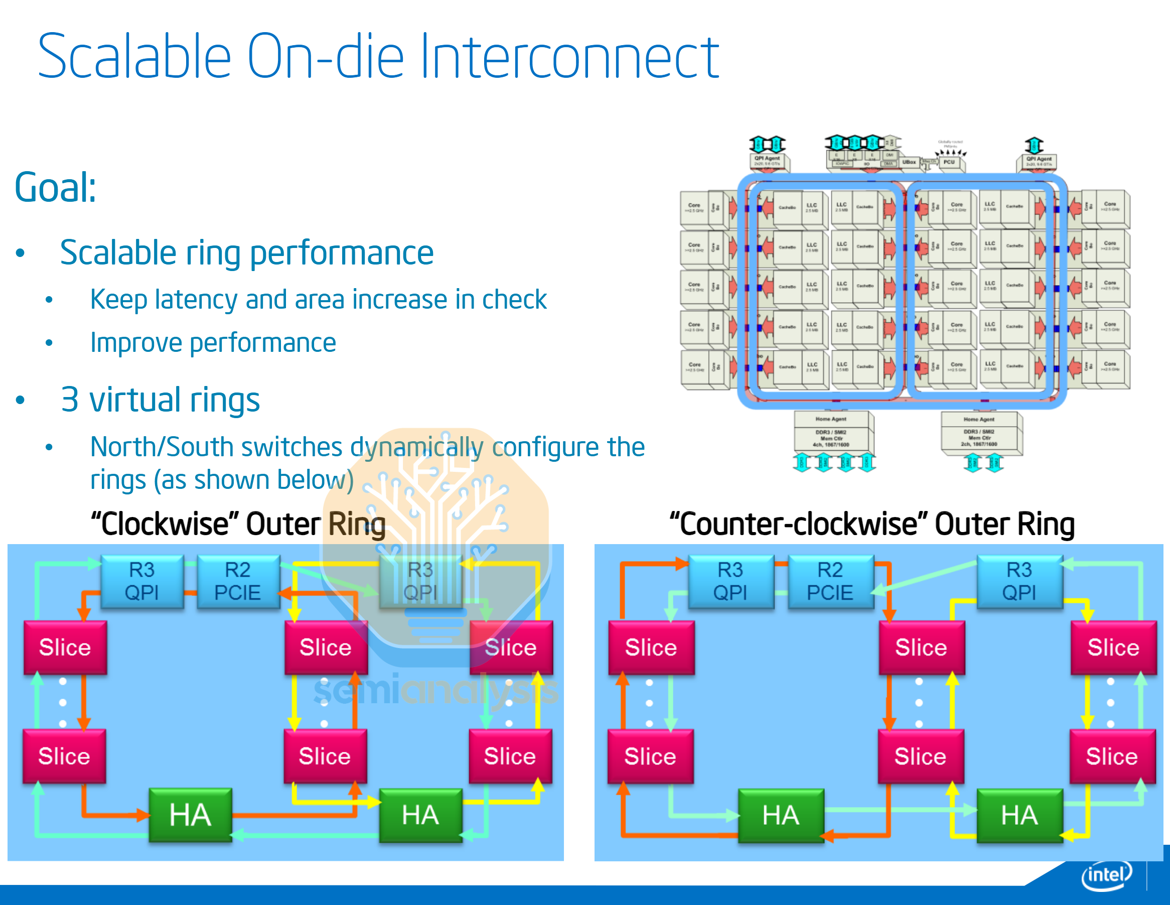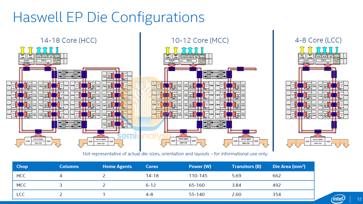 While these methods helped Intel increase core counts to 24, it was not an elegant nor scalable solution. Adding a third ring and two more sets of buffered switches would be too complicated and impractical, creating many NUMA clusters. A new interconnect architecture was required for more cores.