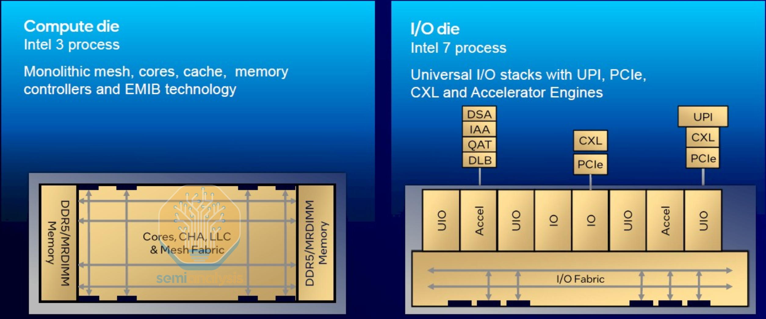 The IMH dies contain the 16-channel DDR5 memory interfaces, PCIe6 with CXL3 support, and Intel datapath Accelerators (QAT, DLB, IAA, DSA).