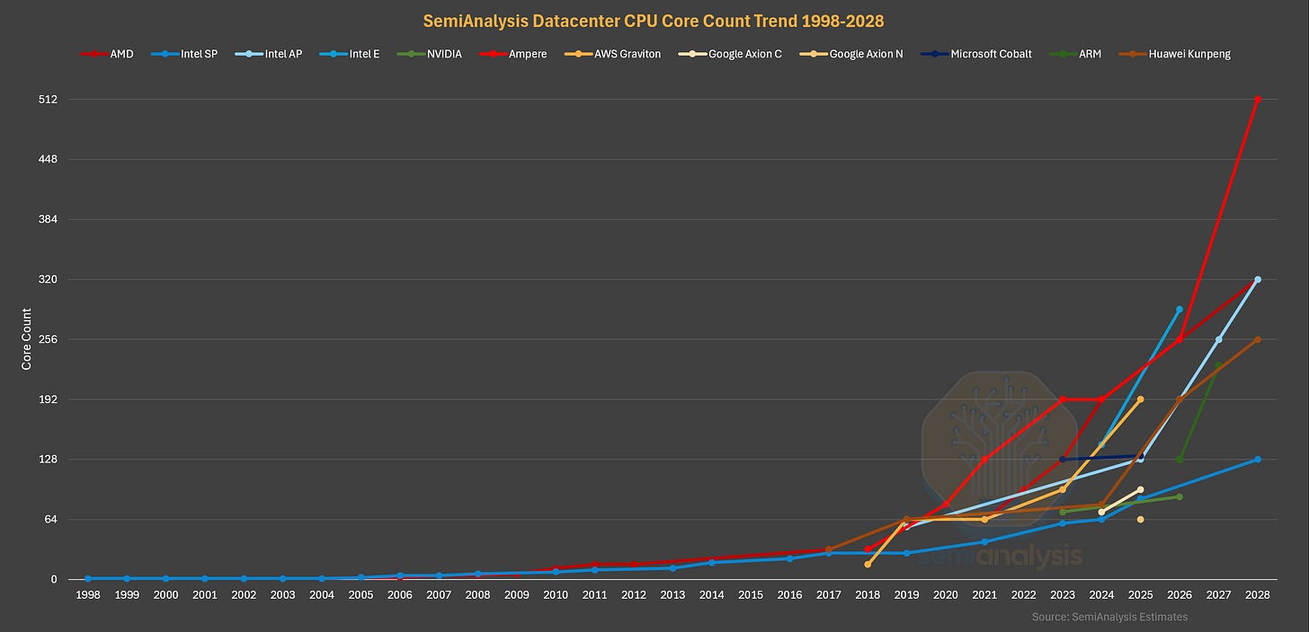 As we go through 2026, the demands on datacenter CPU and DRAM are only getting stronger. Frontier AI labs are running out of CPUs for their RL Training needs and are scrambling for CPU allocation by competing directly with the cloud providers for commodity x86 CPU servers. Intel, facing the unexpected depletion of their CPU inventory, is looking to raise prices across their Xeon line while they ramp additional tools to shore up CPU production. AMD has been increasing their supply capability to grow and take share in a server CPU TAM it believes will grow in the “strong double digits” in 2026. We will discuss how the CPU landscape evolves beyond 2026 for our subscribers below.