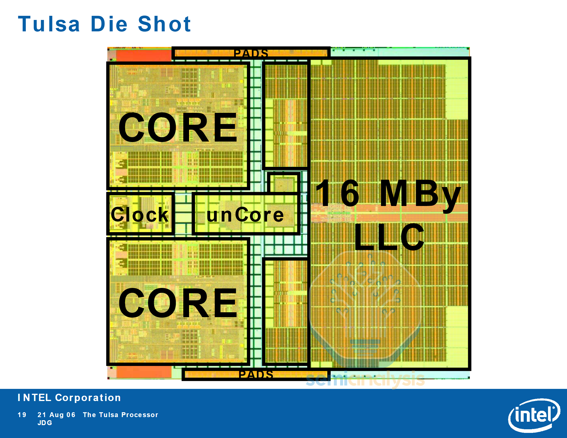 Intel’s subsequent Tulsa generation included 16MB of L3 cache shared between the two cores and functions as an on-die core to core data fabric. As we will see later, these on-die data fabrics will become a crucial factor in datacenter CPU design as core counts grow in the hundreds.