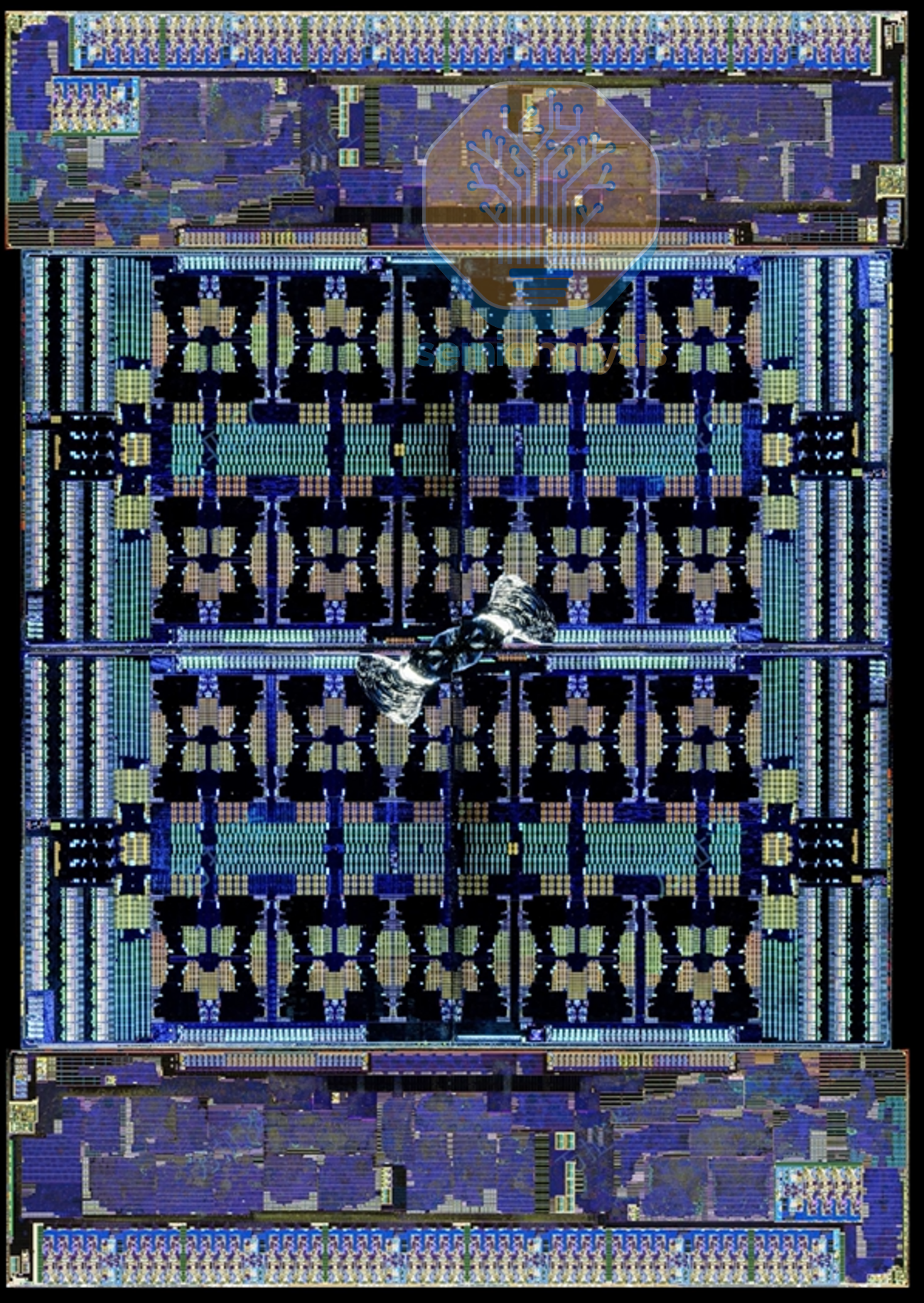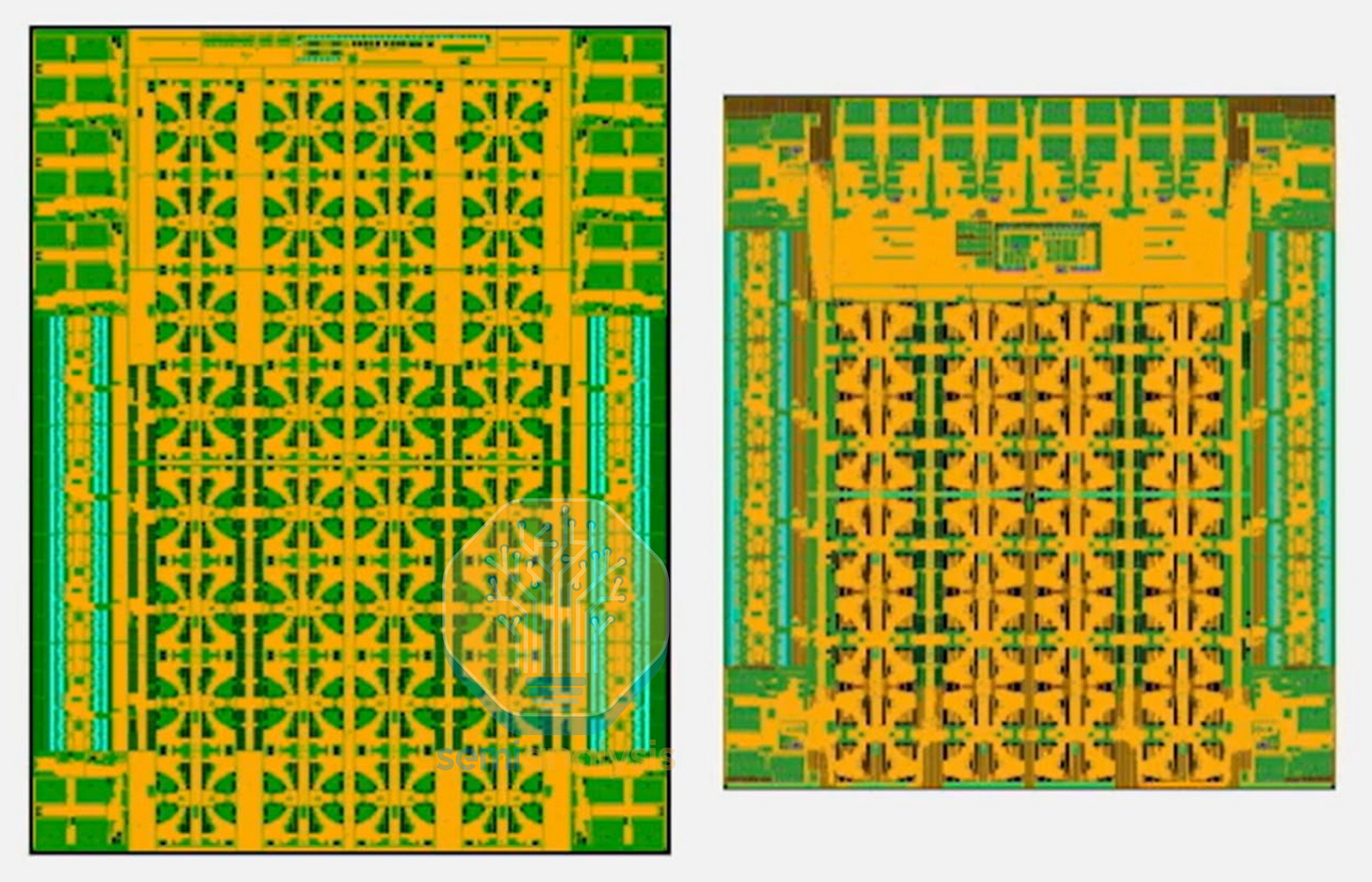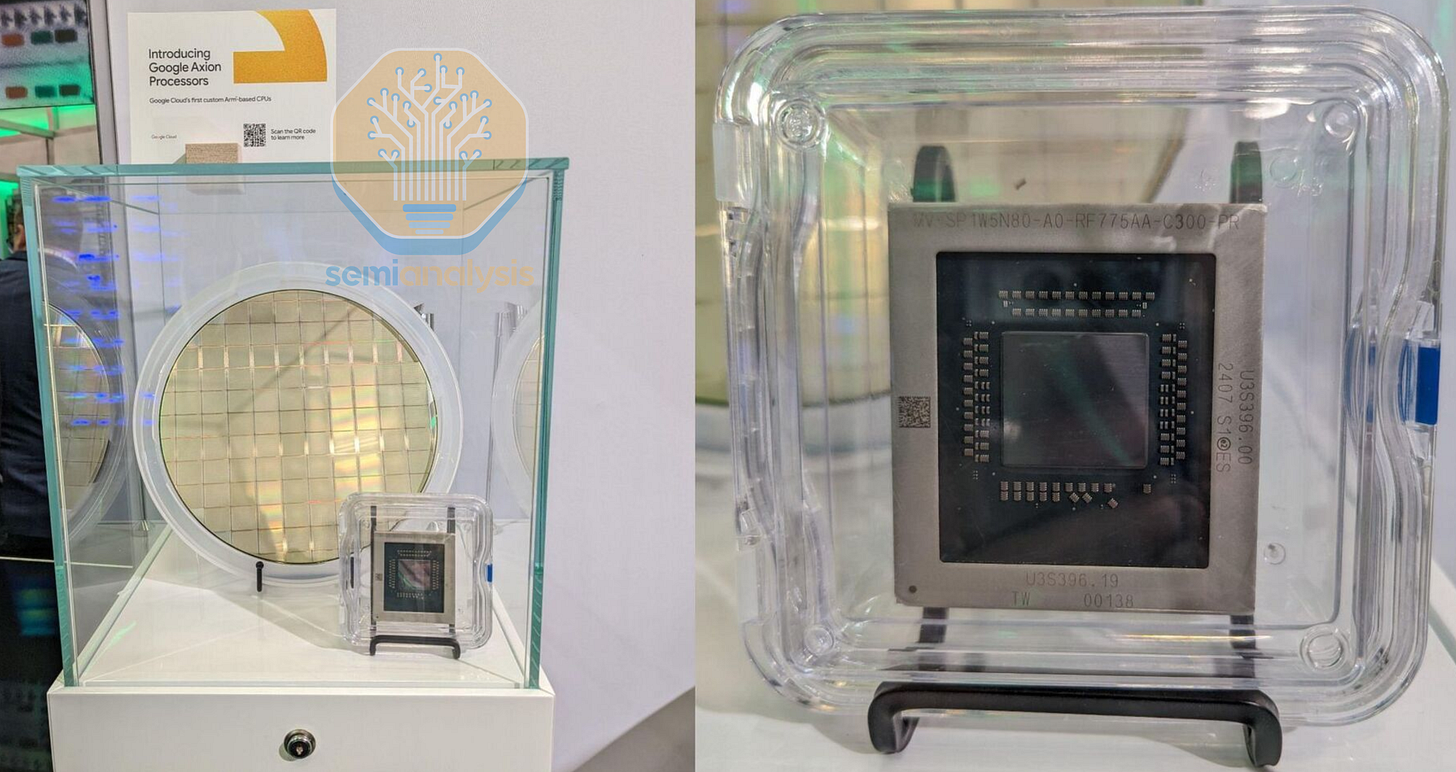 Announced in 2024 and generally available in 2025, The Axion line signaled Google’s entry into custom silicon CPUs for their GCP cloud services. Axion C4A instances have up to 72 Neoverse V2 cores on a standard mesh network, with 8 channels of DDR5 and PCIe5 connectivity on a large monolithic 5nm die. Based on close-up images of the Axion wafer presented at Google Cloud Next 2024, the die appears to have 81 cores printed in a 9x9 mesh, leaving room for 9 cores to be disabled for yield. Therefore, we believe a new 3nm die was designed for the 96-core C4A bare metal instances that went into preview late in 2025.