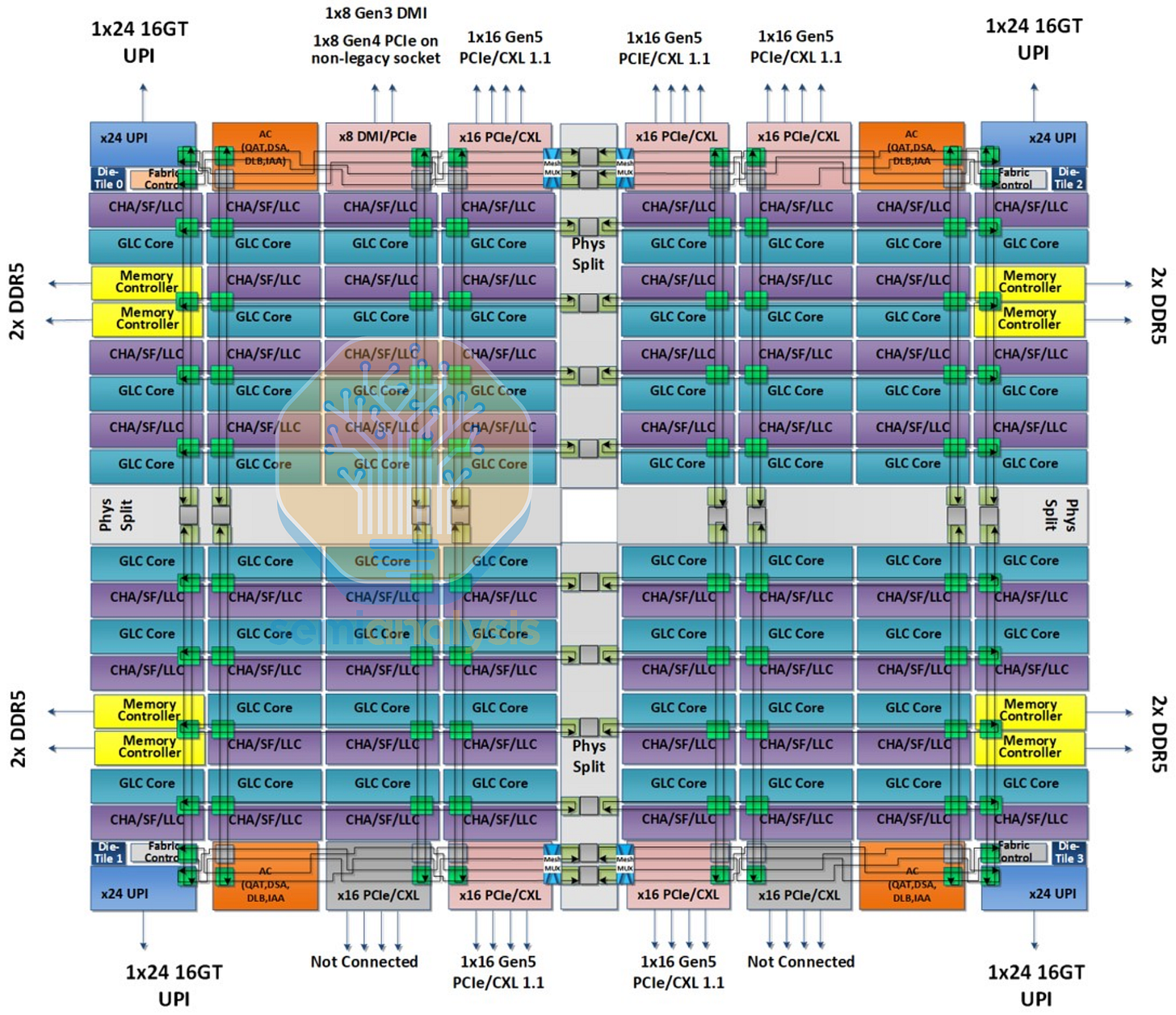 Thus, Sapphire Rapids debuted Intel’s EMIB advanced packaging technology to carry the mesh architecture across dies. Two pairs of mirrored 15-core dies were stitched together with a Modular Die Fabric, creating a much larger 8x12 mesh across four quadrants and nearly 1600 mm2 of silicon. A double row of mesh stops were required for the IO to facilitate the increased data traffic between the doubled throughput of PCIe 5.0 and the new data accelerator blocks.