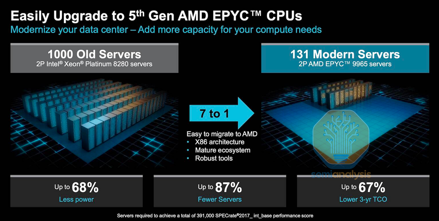 Socket consolidation ratios of 10:1 or greater can be achieved. Millions of Intel Cascade Lake servers bought during the COVID cloud spend are being retired for the latest AMD and Intel CPUs that process at the same performance level but at less than a fifth of the power.