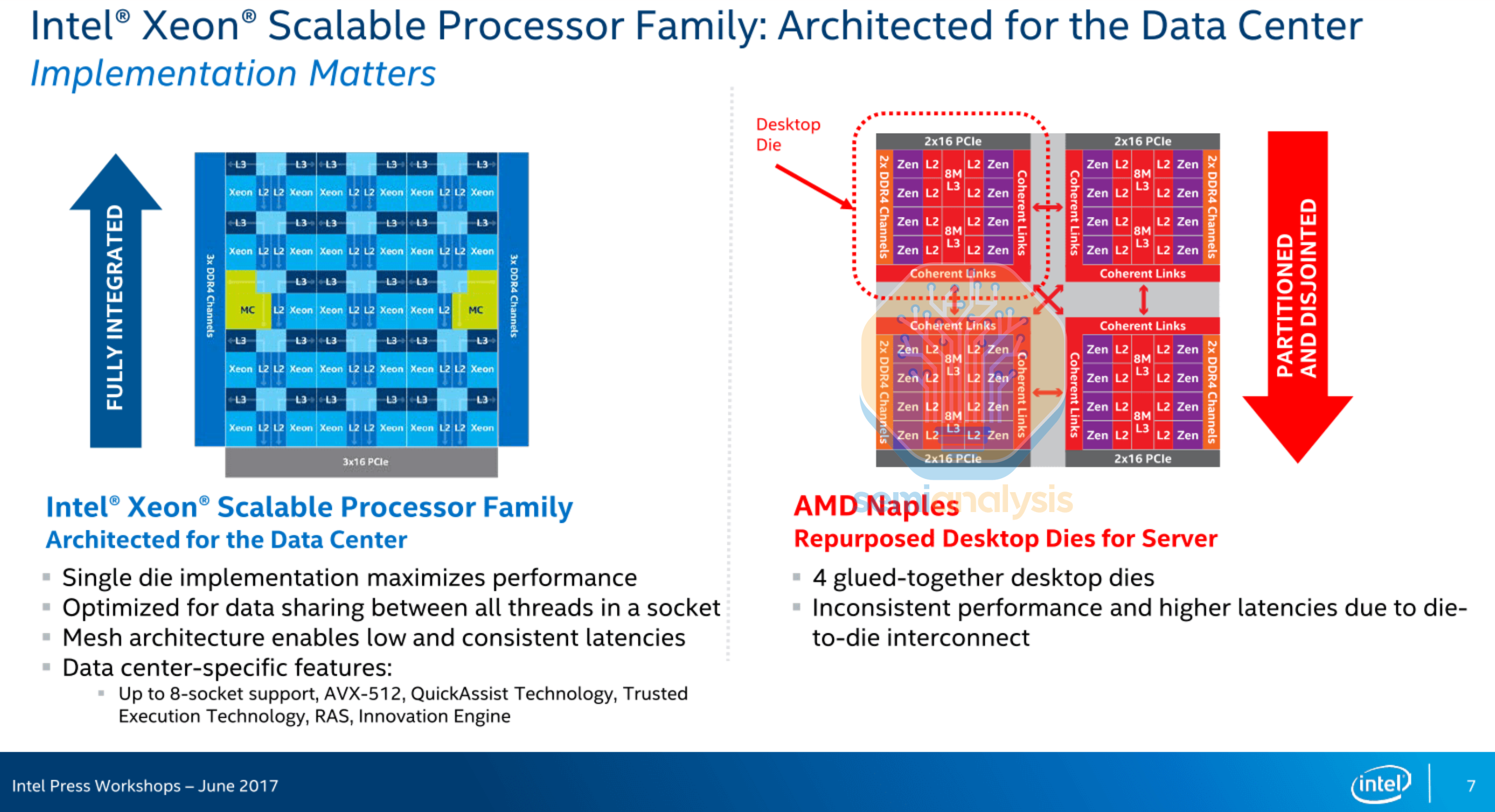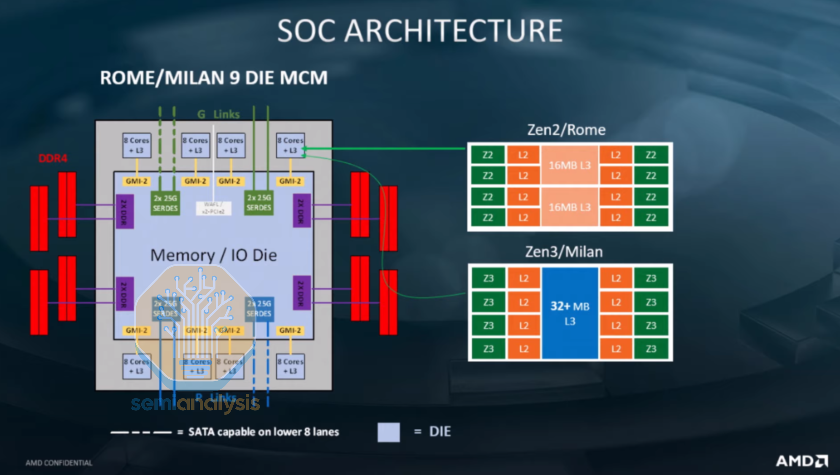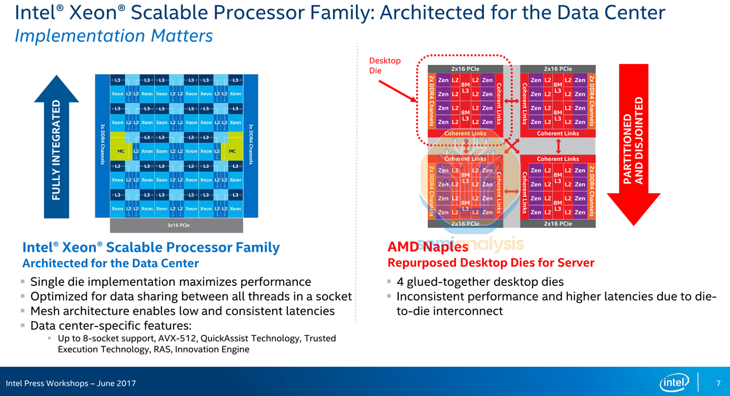 Naples implemented a 4-die MCM with each “Zeppelin” die containing 8 cores, allowing AMD to exceed Intel’s 28 cores with 32. Each die holds 2 Core Complexes (CCX), with 4 cores and 8MB of L3 connected with a crossbar. An on-die Scalable Data Fabric enables inter-CCX communication. Infinity Fabric on Package (IFOP) links connected each die to the other 3 in the package, while Infinity Fabric Inter Socket (IFIS) links enabled dual-socket designs. Infinity Fabric enabled coherent memory sharing between dies, and was derived from their old HyperTransport technology.