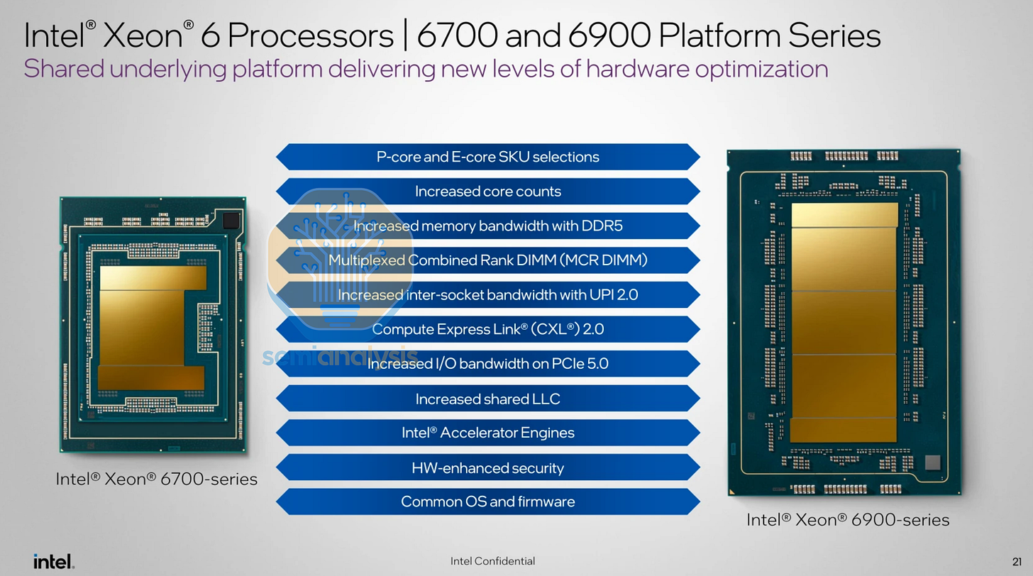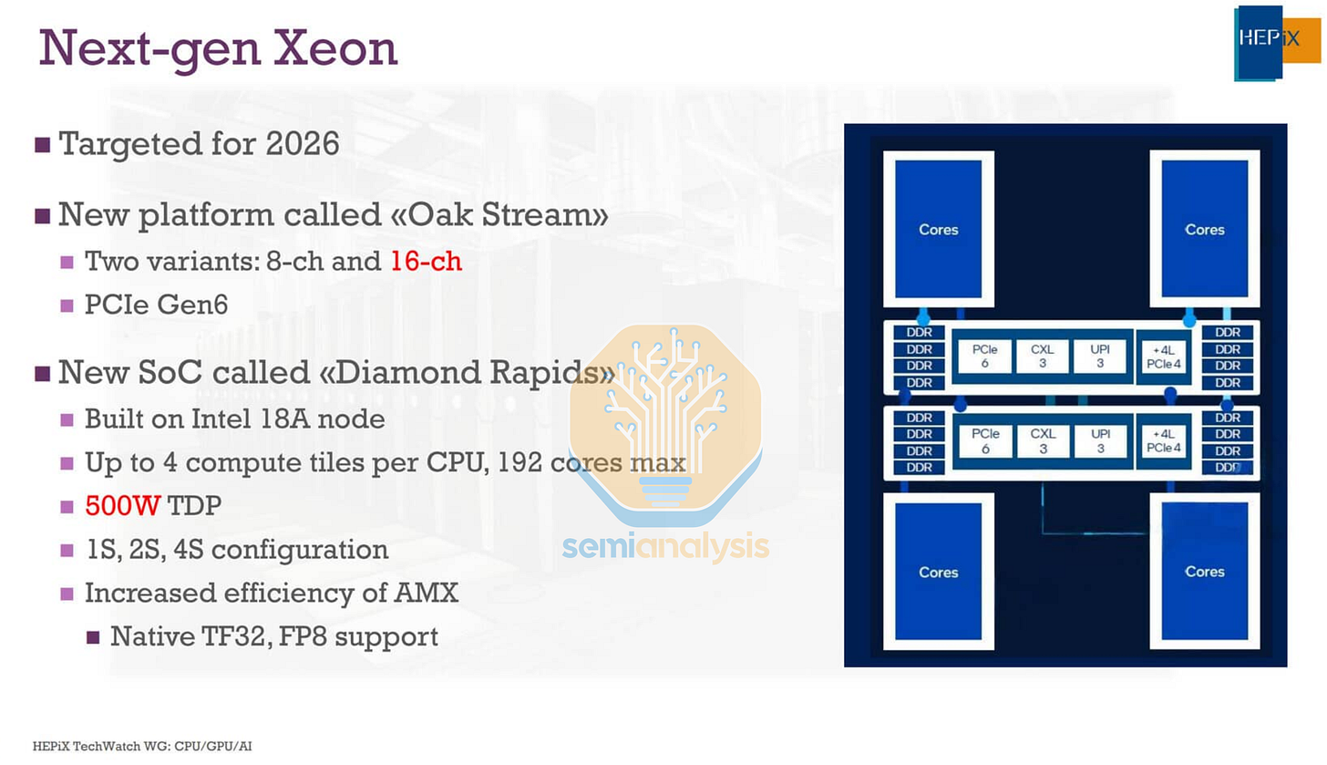 In a late move, Intel has cancelled the mainstream 8-channel Diamond Rapids-SP platform entirely, leaving their highest volume core market without a new generation into at least 2028. While this helps streamline Intel’s bloated SKU stack, we feel this is the wrong move as general purpose compute for AI tool use and context storage uses more mainstream CPUs with good connectivity as opposed to massive performance per socket options.