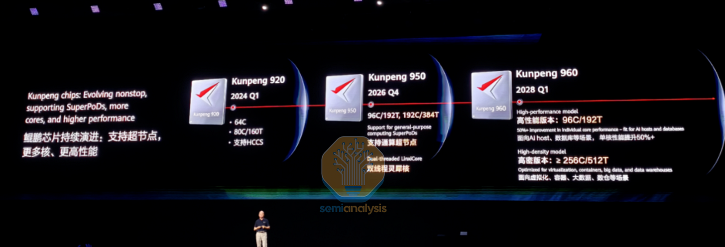 Huawei’s roadmap continues into 2028 with the Kunpeng 960 series. This generation follows the trend of splitting the design into two variants. A 96 core, 192 thread high performance version will be made for AI head nodes and databases that promises a 50%+ improvement in per core performance, while a high-density model for virtualization and cloud compute will increase core counts to 256 and possibly beyond. By then, we expect Huawei to take significant share in Chinese hyperscaler CPU deployments.