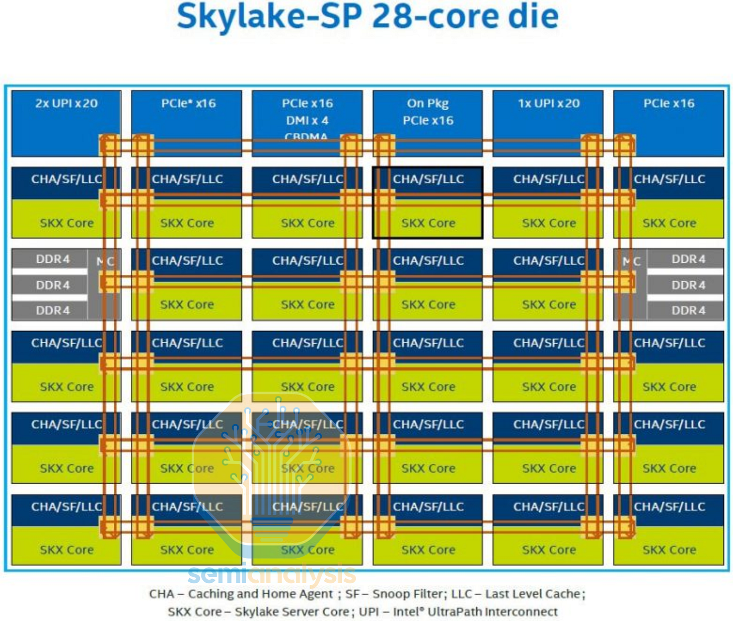 To solve the scalability problem, Intel adopted the mesh interconnect architecture used in their 2016 Xeon Phi “Knights Landing” processor for their mainline Skylake-X Xeon Scalable CPUs in 2017, bringing 28 cores in the XCC die. While core counts did not increase much over Broadwell, the design would form the base that would scale core counts over the next decade.