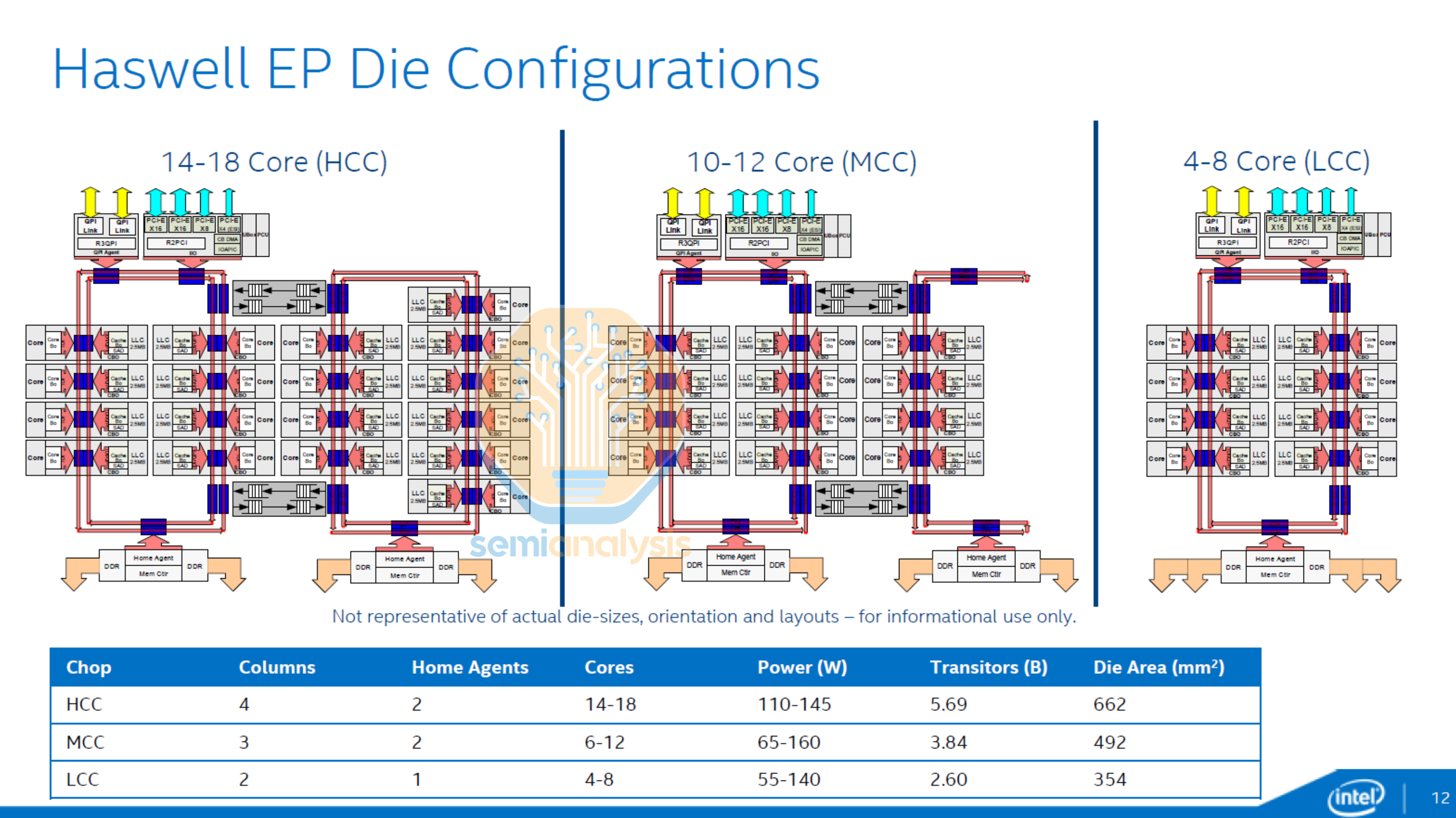 In 2014, Intel changed topologies yet again with the 18-core Haswell HCC die featuring dual independent counter rotating ring buses connected with a pair of bi-directional buffered switches. Memory controllers were split amongst the two rings, with the 8-core ring also housing the IO ring stops. The MCC die variant wrapped a single half-ring back on itself. Broadwell HCC, released in 2015, brought core counts up to 24 with dual 12-core ring buses.