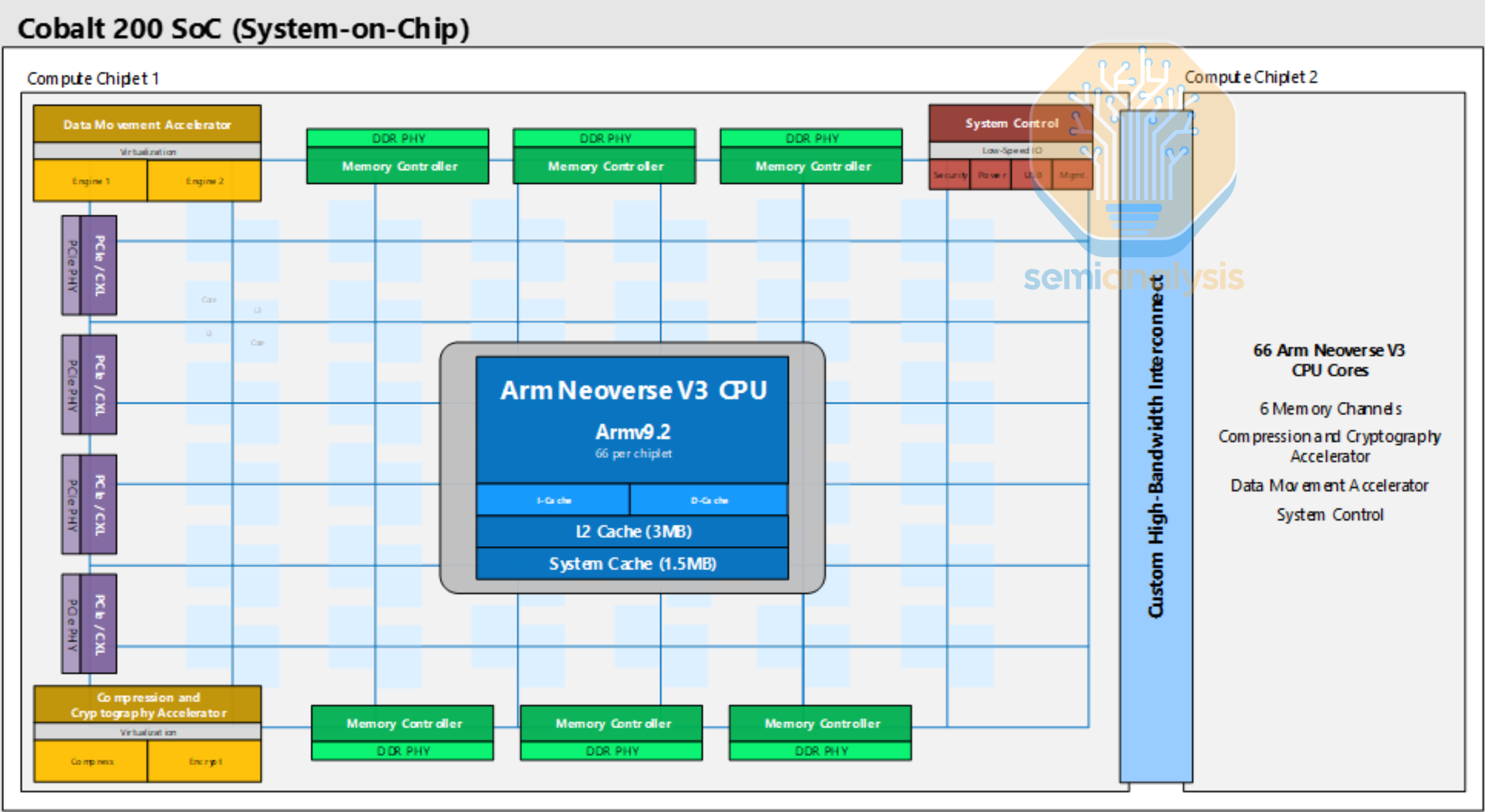Following on from Microsoft’s first Cobalt 100 CPU in 2023 which we covered above, Cobalt 200 was launched in late 2025 with several upgrades. While core count did not increase much, going from 128 to 132, each core is now much more powerful with the Neoverse V3 design compared to the Neoverse N2 in the prior generation. Each core has a very large 3MB L2 cache, and are connected with the standard ARM Neoverse CMN S3 mesh network across two TSMC 3nm compute dies with a custom high-bandwidth interconnect between dies. From the diagram, each die has an 8x8 mesh with 6 DDR5 channels and 64 lanes of PCIe6 lanes with CXL support. 2 cores share each mesh stop, totaling 72 cores printed on each die with 66 enabled for yield. 192MB of shared L3 cache is also spread across the mesh. With these upgrades, Cobalt 200 achieves a 50% speedup over Cobalt 100.