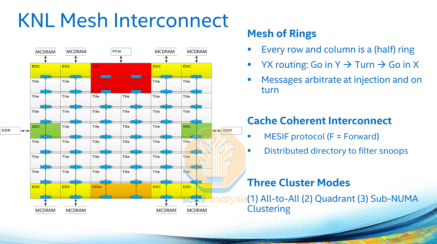 In Knights Landing, each mesh stop housed two cores with a shared L2 cache. The mesh grid is 6 columns by 9 rows in size, with top and bottom rows more IO and MCDRAM. The mesh network runs on it’s own clock, and can dynamically adjust mesh clocks to save power. On Knights Landing, the mesh ran at 1.6GHz.