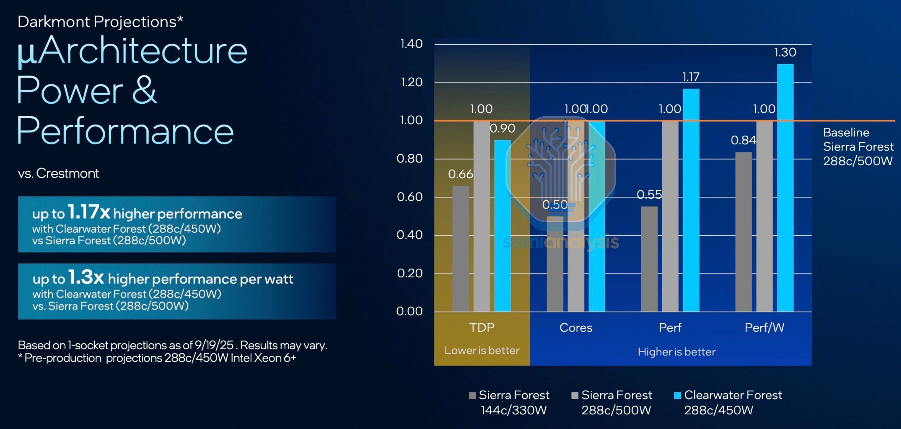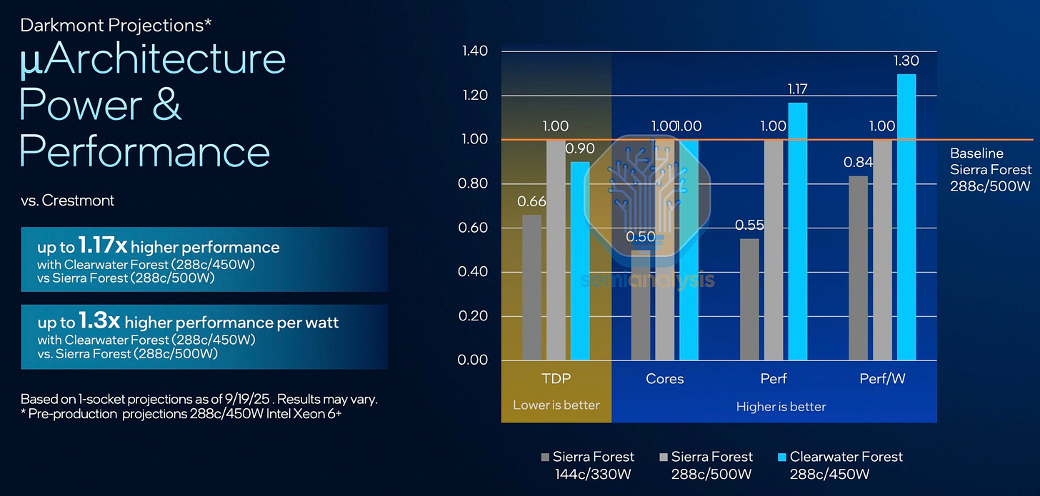 Despite a two-year gap with new core micro-architecture, new node, new advanced packaging and higher cost, Intel showed Clearwater Forest as being only 17% faster than Sierra Forest at the same core counts. With such limited performance gains despite much higher costs from low hybrid bonding yields, it is no wonder that Intel barely mentioned Clearwater Forest in their latest Q4 ’25 earnings. Our take is that Intel does not want to produce these chips in high volumes which hurt margins and would rather keep this as a yield learning vehicle for Foveros Direct.
