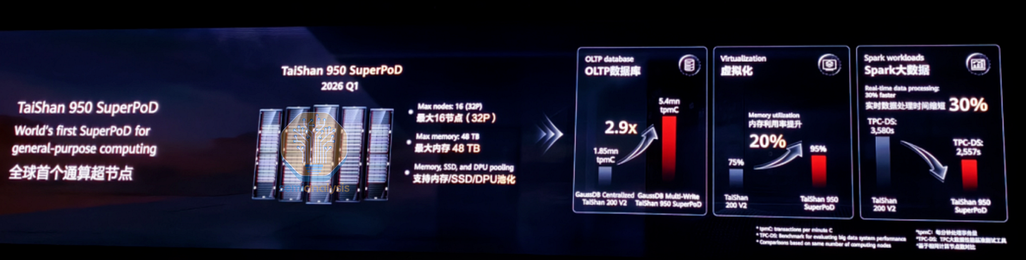 For 2026, Huawei is updating its CPU line again with the Kunpeng 950 and configuring them in TaiShan 950 SuperPoD racks for general purpose compute. Kunpeng 950 promises a 2.9x speedup on OLTP database performance over the Kunpeng 920B using their proprietary GaussDB Multi-Write distributed database architecture. To achieve this, core counts more than doubled to 192 using a new LinxiCore that retains SMT support. A smaller 96 core version will also be produced. 16 dual-socket servers go into each TaiShan 950 SuperPoD rack with up to 48TB of DDR5 memory, indicating a 12-channel memory design. These racks also integrate storage and networking, and will be adopted by Oracle’s Exadata database servers and used by China’s finance sector. The design will likely be produced on SMIC’s N+3 process that recently debuted in the Kirin 9030 smartphone chip.