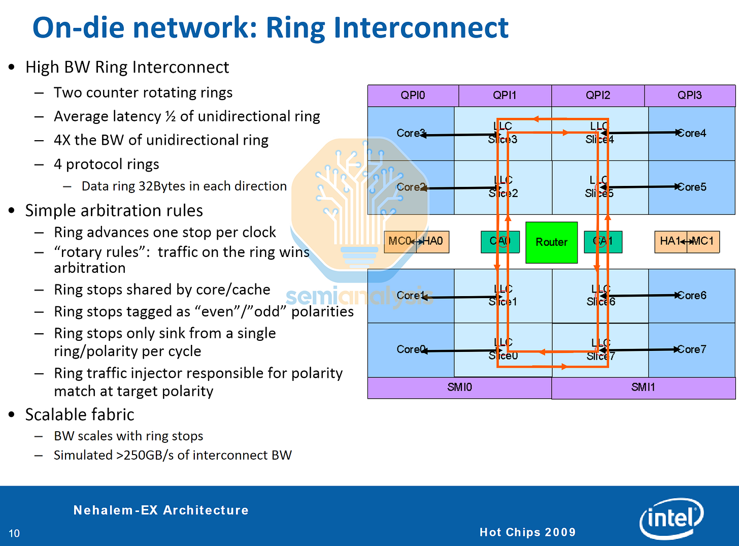 To scale past this limit, Intel implemented a ring bus architecture with their Nehalem-EX (Beckton) Xeons in 2010, bringing 8 cores with integrated memory controllers and inter-socket QPI links into a single die. Implemented in earlier years within ATi Radeon GPUs and the IBM Cell processor, the ring bus arranges all nodes into a loop, with ring stops integrated into the L3 cache slices and wiring in the metal layers above the cache. Caching and Home agents deal with memory snooping between cores and coherence with the memory controller.