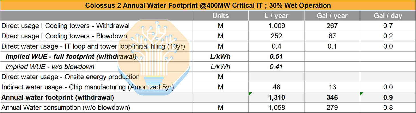 Then we have water used during power generation. In the case of Colossus 2, the datacenter currently uses aeroderivative simple-cycle turbines from Solar Turbines with no steam or combined cycle, which means no water is consumed during the power generation process. The water profile could change if future CCGT turbines are included, but for now let’s keep the current layout.