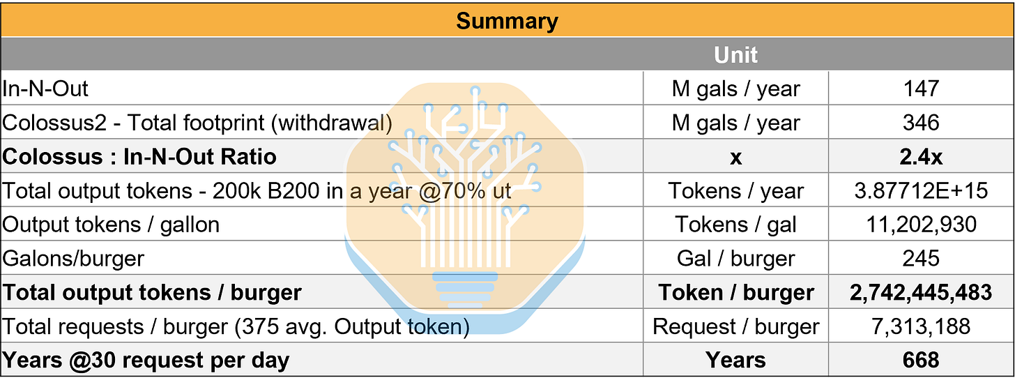 The duel is on. Colossus 2’s blue water footprint is around 346 million gallons per year, while an average In-N-Out store (yes, burgers only) comes in at around 147 million gallons. That’s roughly a ~2.5 : 1 ratio. We’ll let the reader decide what to make of thr important information that one the largest datacenters in the world only consumes as much water as 2.5 In-N-Out’s.