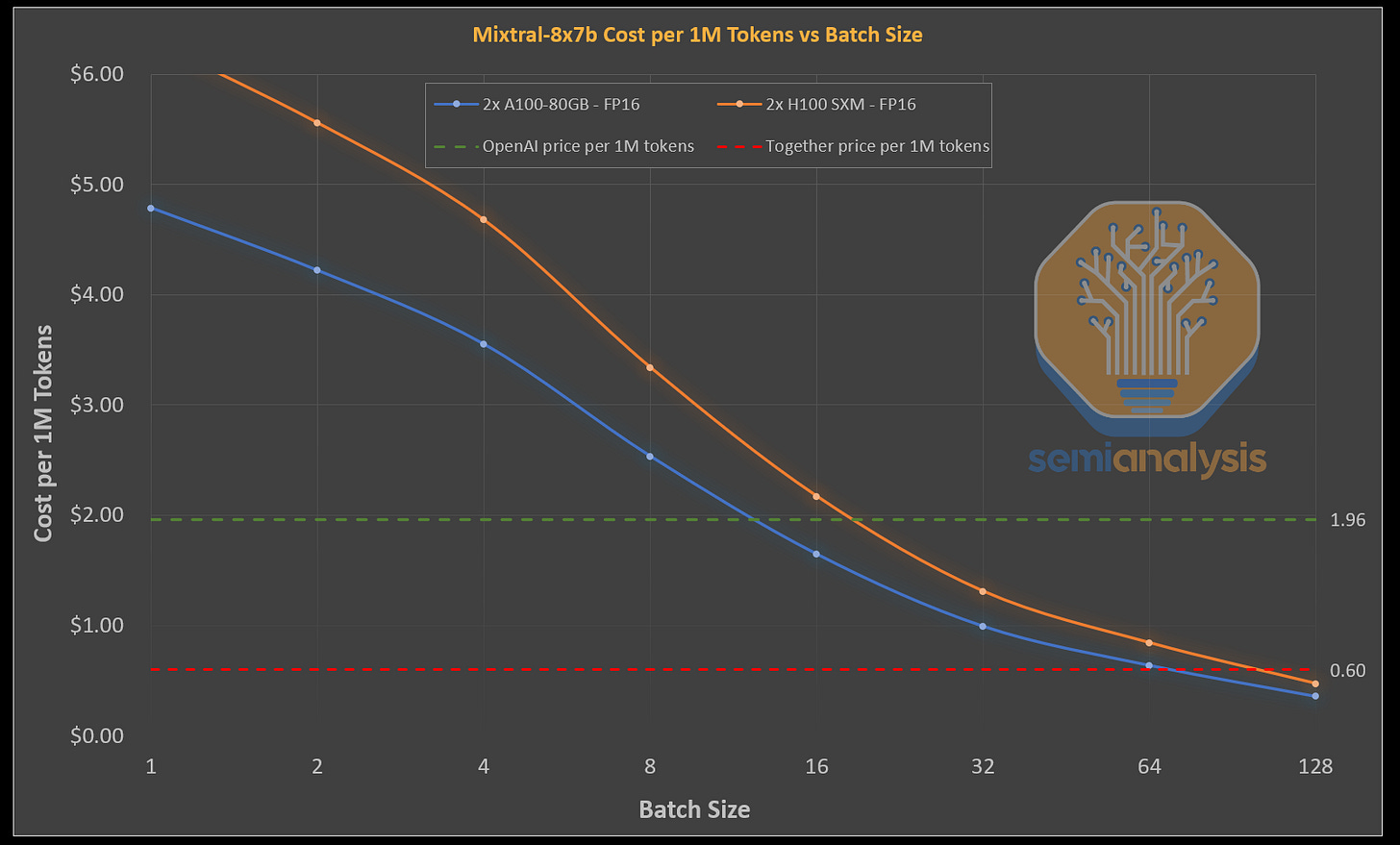 As we discussed in the Inference Race to the Bottom analysis, many firms are genuinely losing money on their Mixtral API inference service. Some also have very low-rate limits to limit the amount they lose. We dove deeper into quantization and other hardware GPU options such as MI300X in the report, but the key takeaway is those serving an unmodified model (FP16) required batch sizes of 64+ to turn a profit. We believe that Mistral, Together, and Fireworks are serving Mistral at breakeven to slight profit margins.