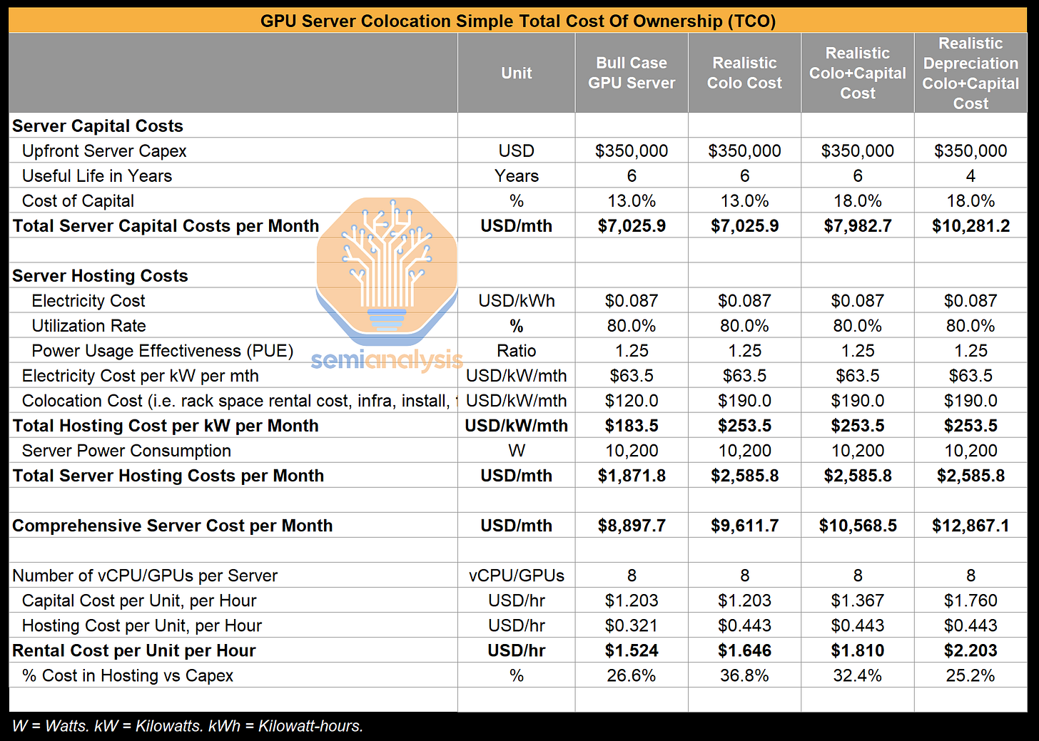 Once we account for these factors, the Tokenomics (cred swyx for swanky new word), look very different. On the Nvidia side we will use the GPU cloud economics explained here and shown below.