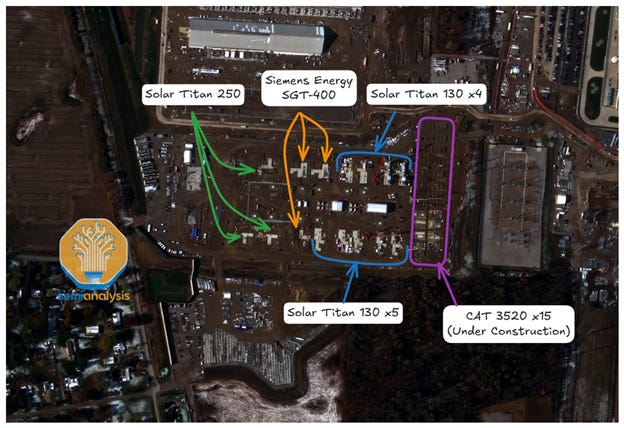 Other hyperscalers quickly followed suit. Meta’s deployment in Ohio, with Williams, is illustrative – with their power plant comprising five different types of turbines & engines, clearly the design pattern was “I’ll deploy whatever I can get on time!”