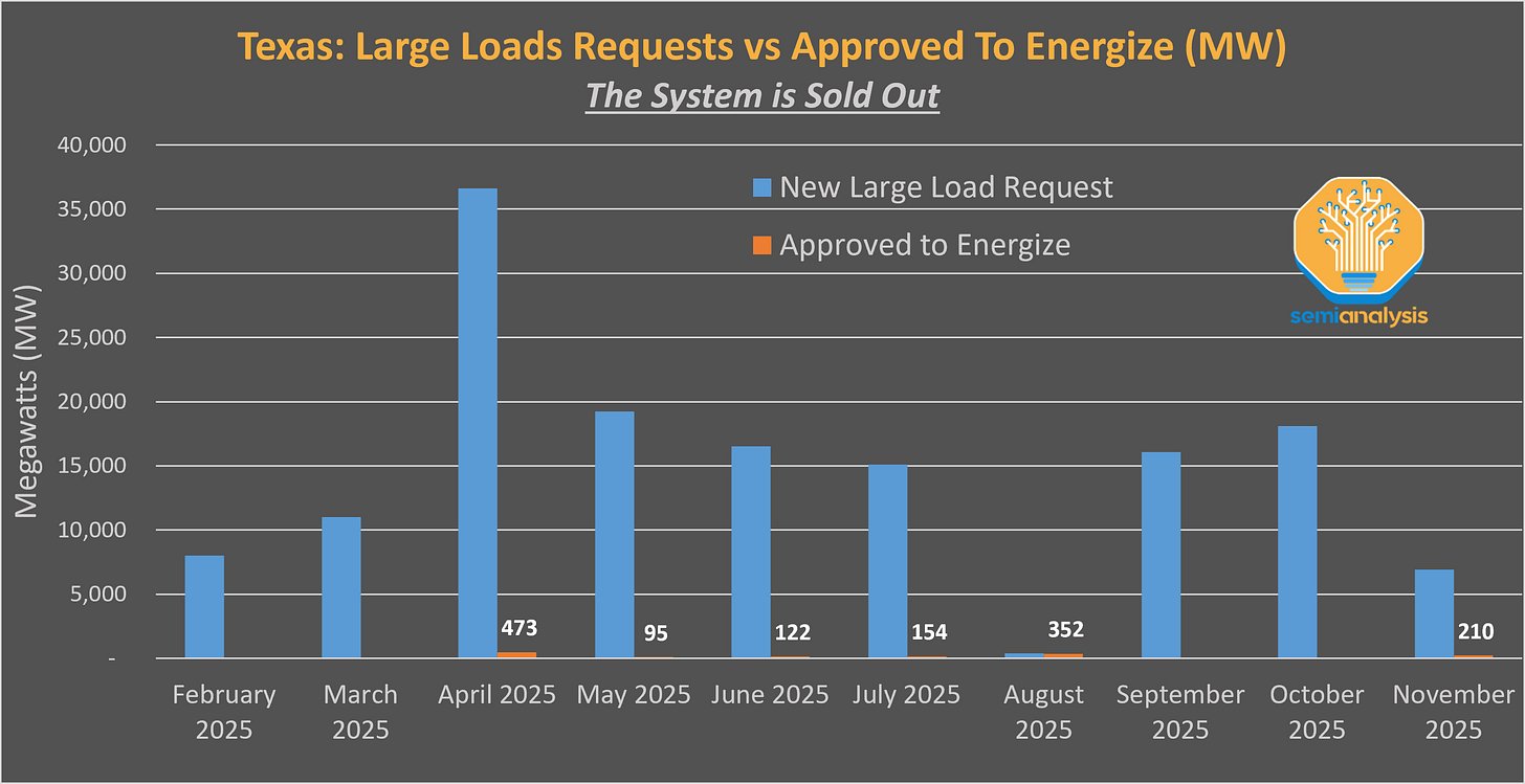 The chart below tells the story: in Texas alone, tens of gigawatts of datacenter load requests pour in each month. Yet in the past 12 months, barely more than a gigawatt has been approved. The grid is sold out.